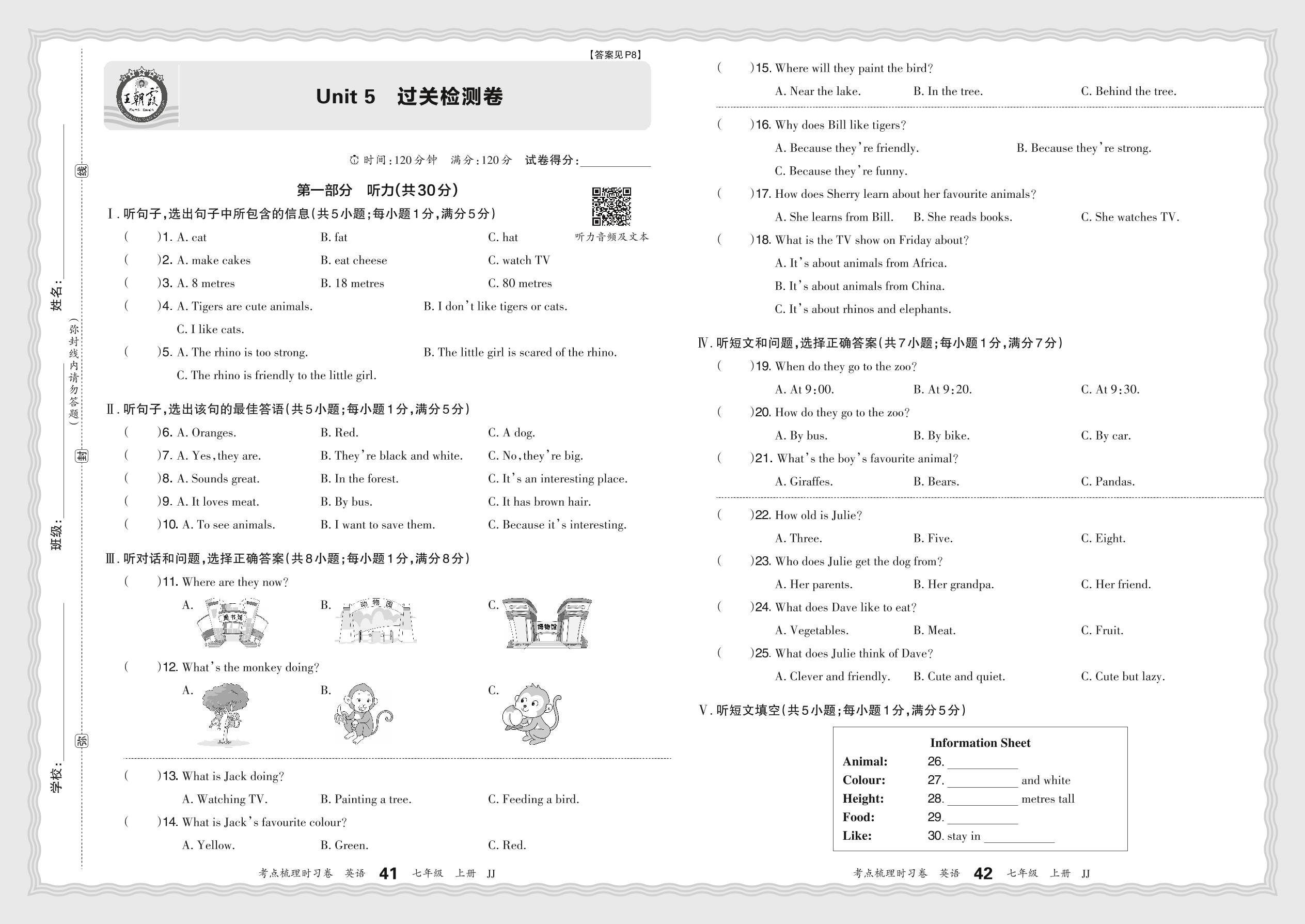2024秋上册七年级英语冀教版 Unit 5 过关检测卷