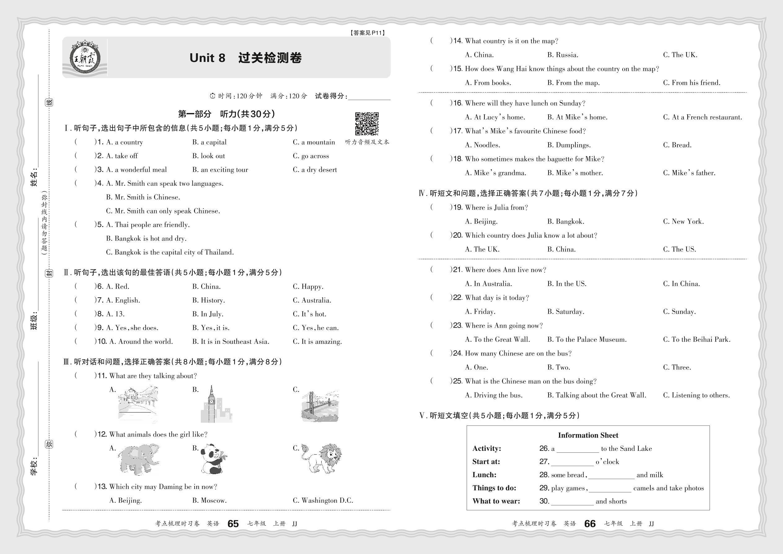 2024秋上册七年级英语冀教版 Unit 8 过关检测卷