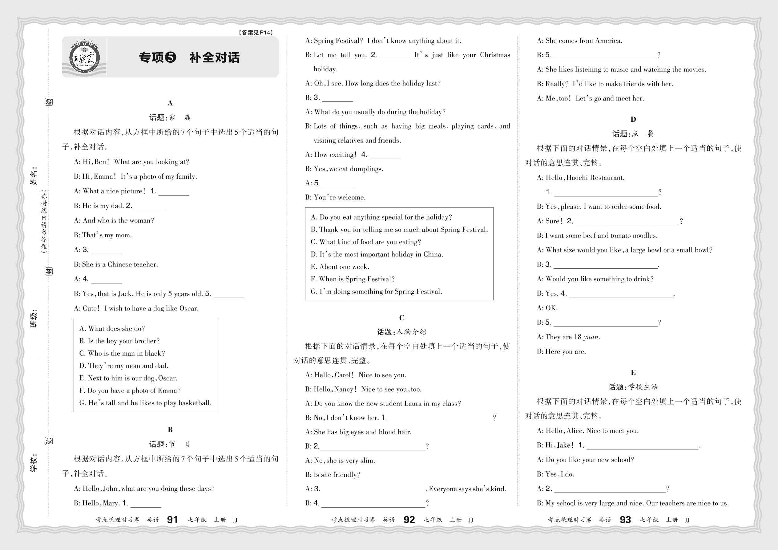 2024秋上册七年级英语冀教版 期末专项卷KD版·补全对话【5】