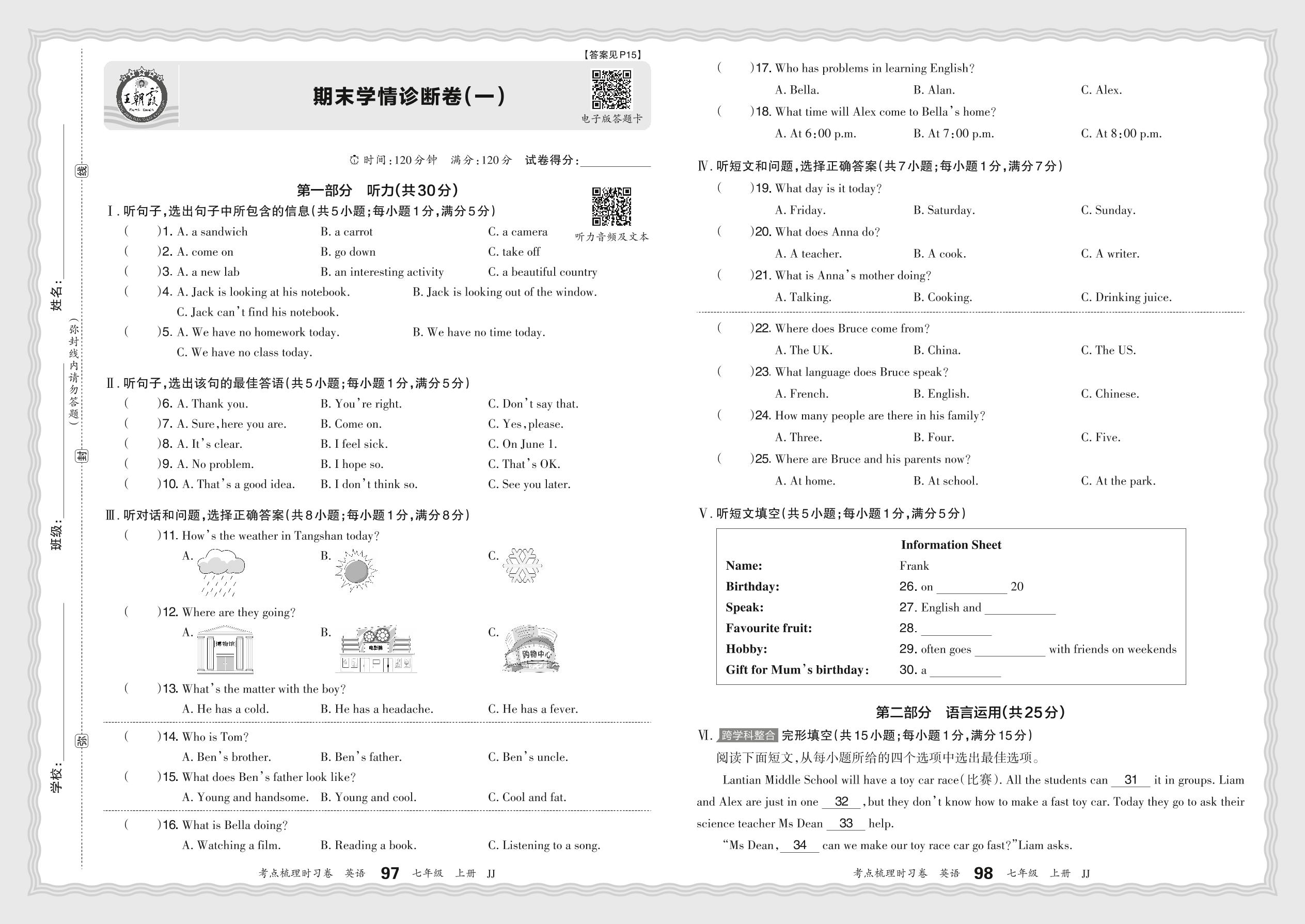 2024秋上册七年级英语冀教版 期末学情诊断卷(一)