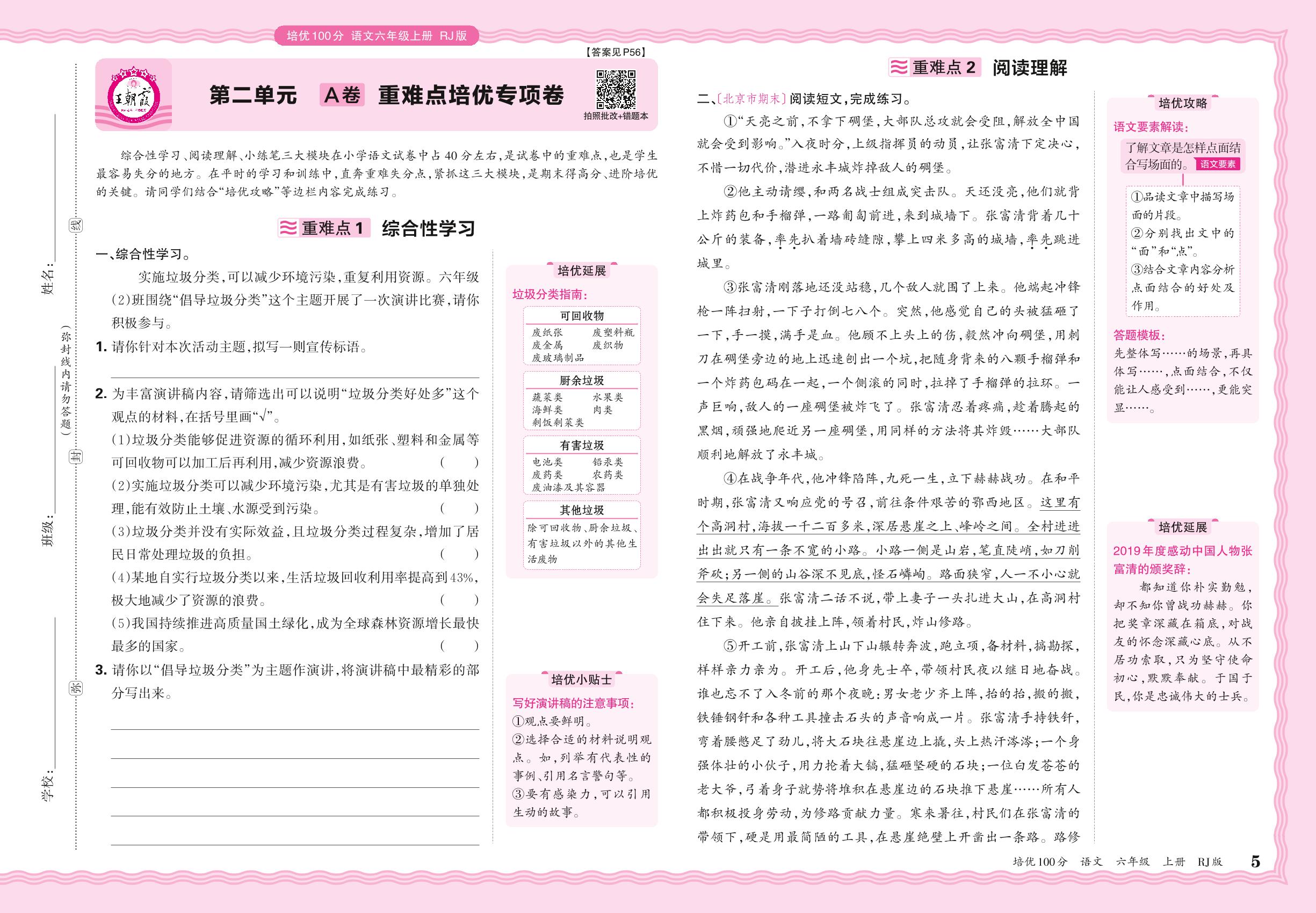 2024秋上册六年级语文人教版 第二单元A卷 重难点培优专项卷