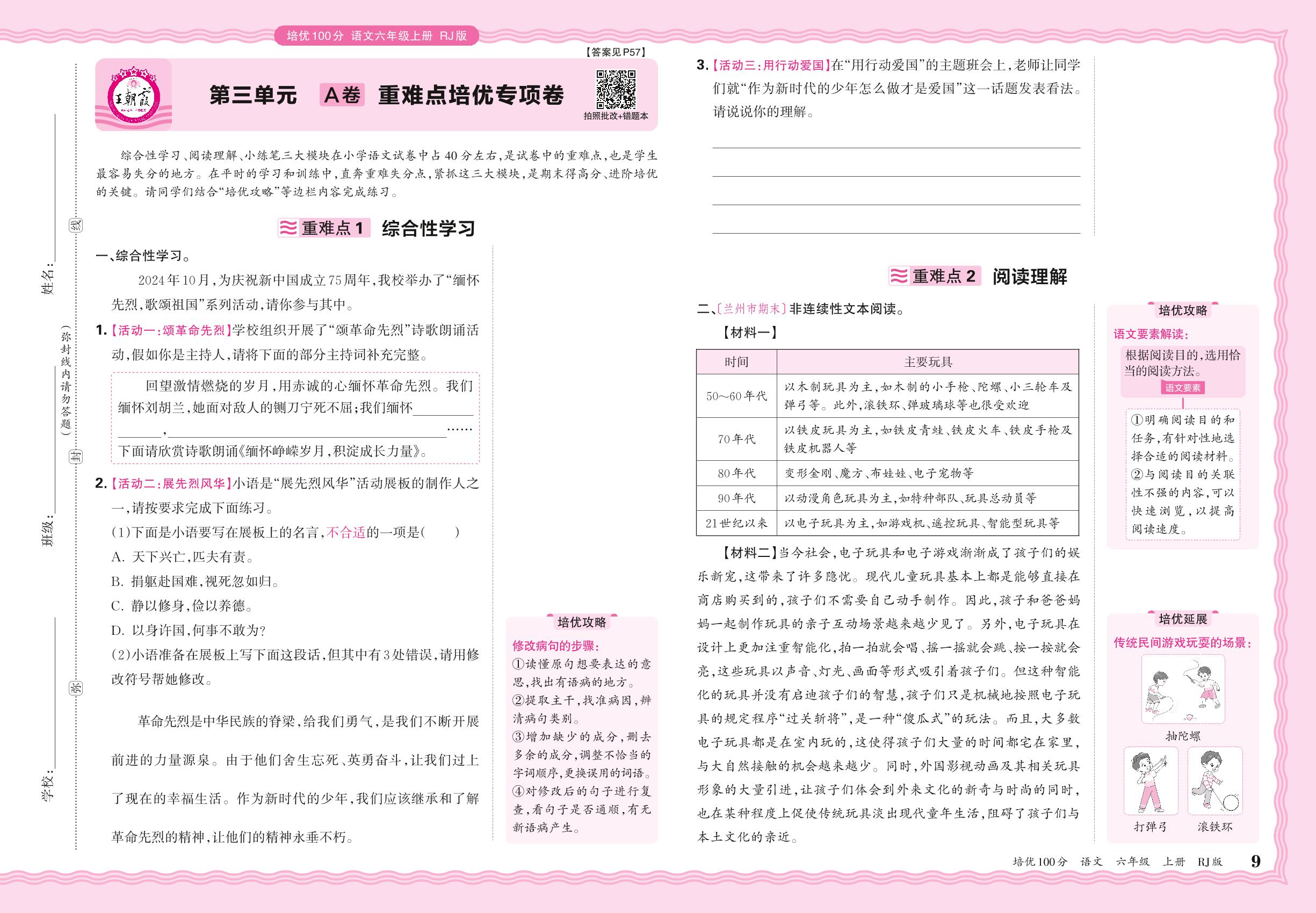 2024秋上册六年级语文人教版 第三单元A卷 重难点培优专项卷