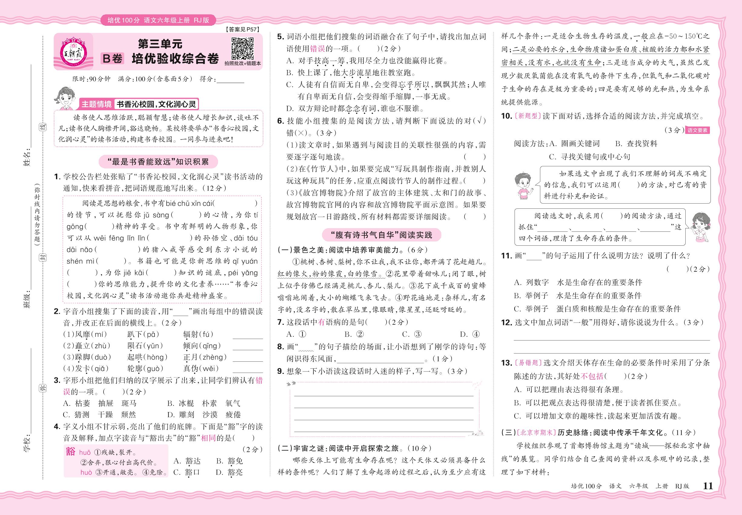 2024秋上册六年级语文人教版 第三单元B卷 培优验收综合卷