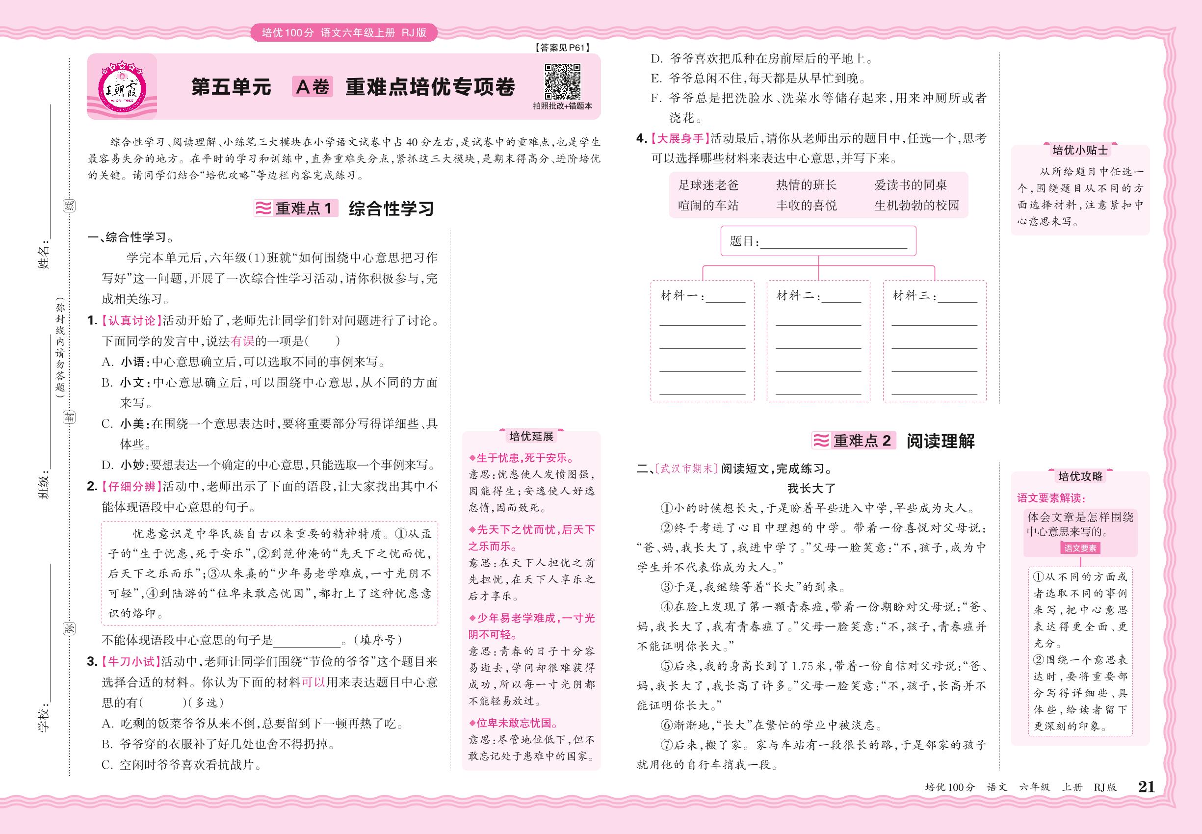 2024秋上册六年级语文人教版 第五单元A卷 重难点培优专项卷