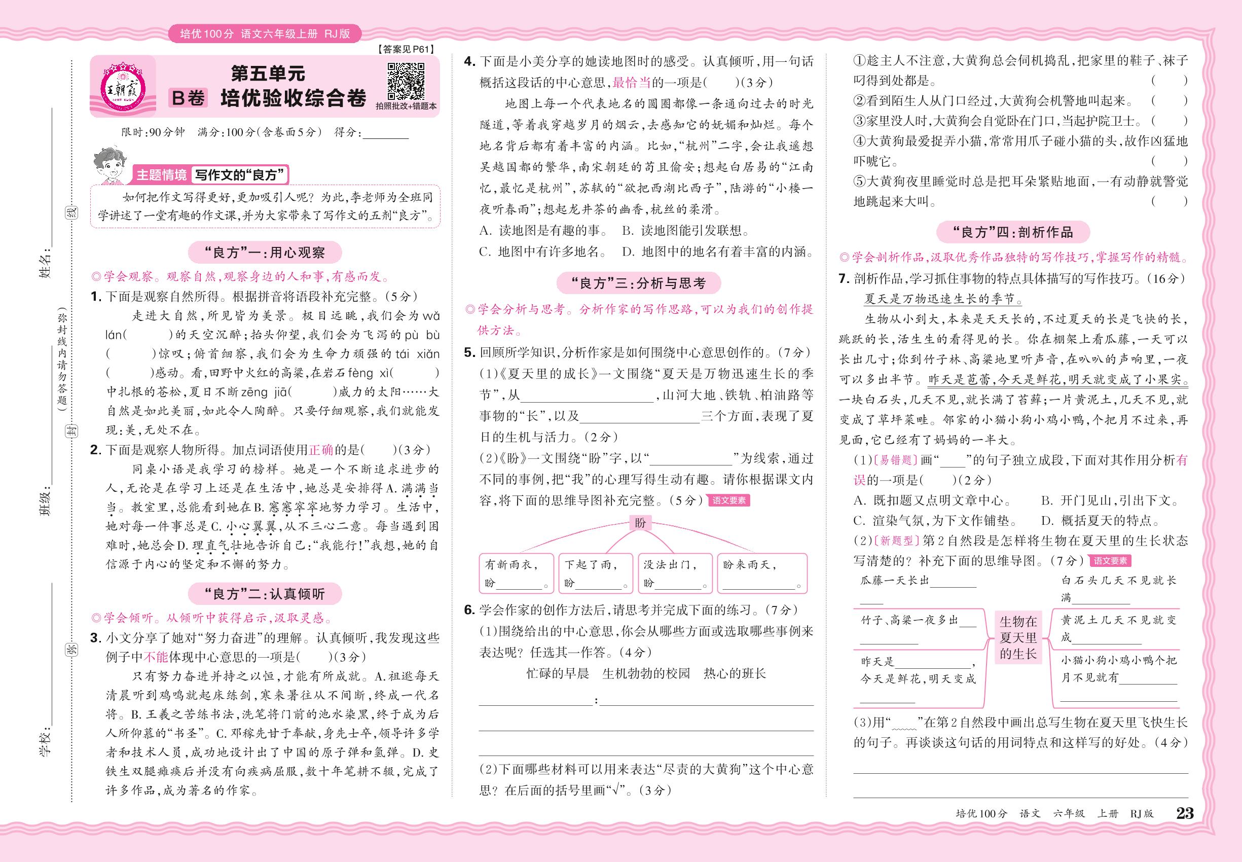 2024秋上册六年级语文人教版 第五单元B卷 培优验收综合卷