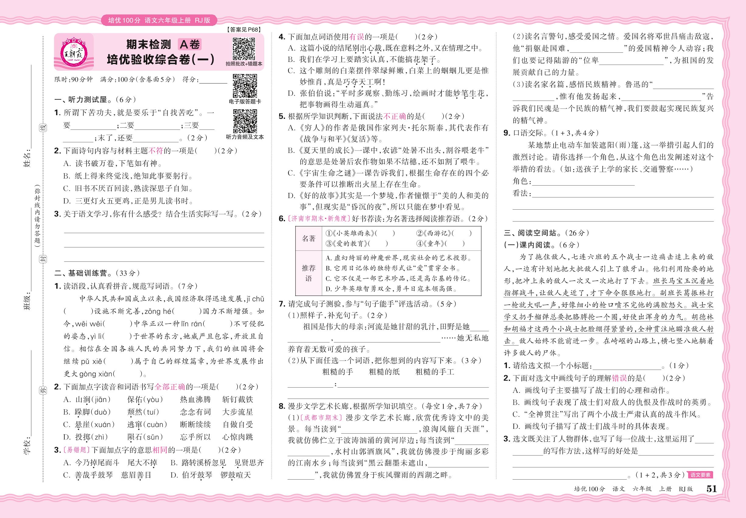 2024秋上册六年级语文人教版 期末检测A卷 培优验收综合卷(一)