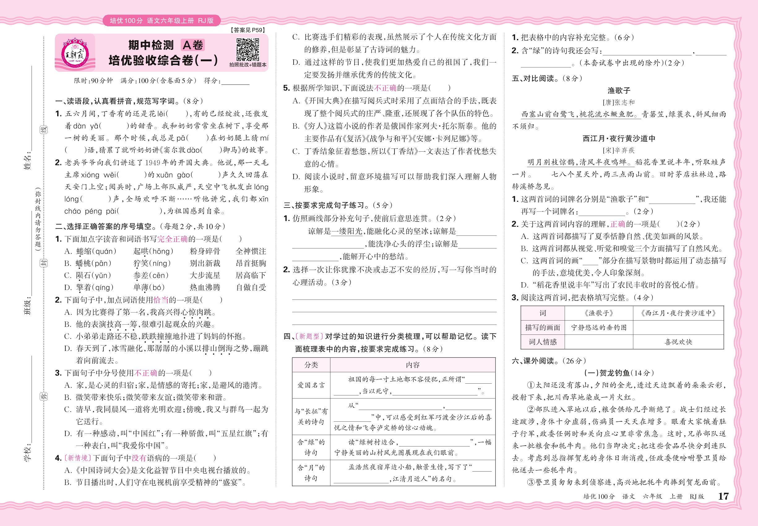 2024秋上册六年级语文人教版 期中检测A卷 培优验收综合卷(一)