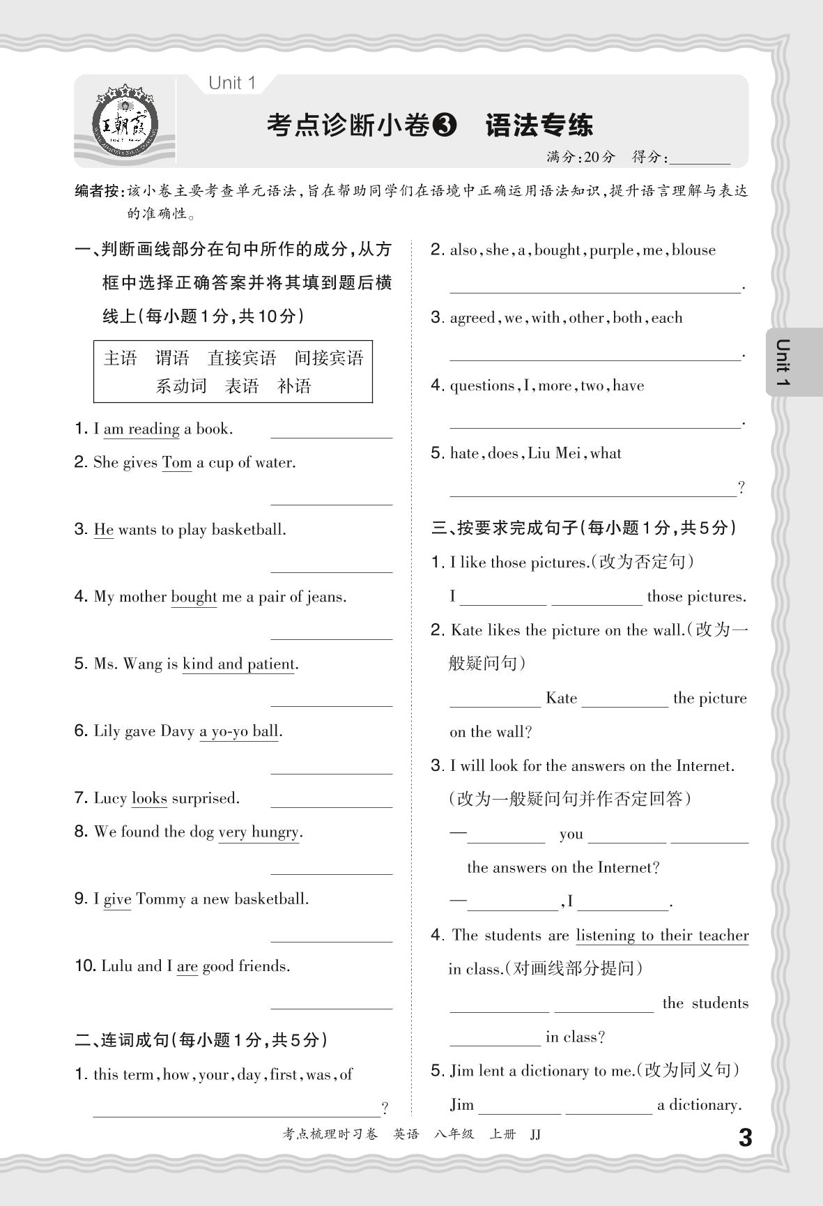 2024秋上册八年级英语冀教版 Unit 1 考点诊断小卷3 语法专练