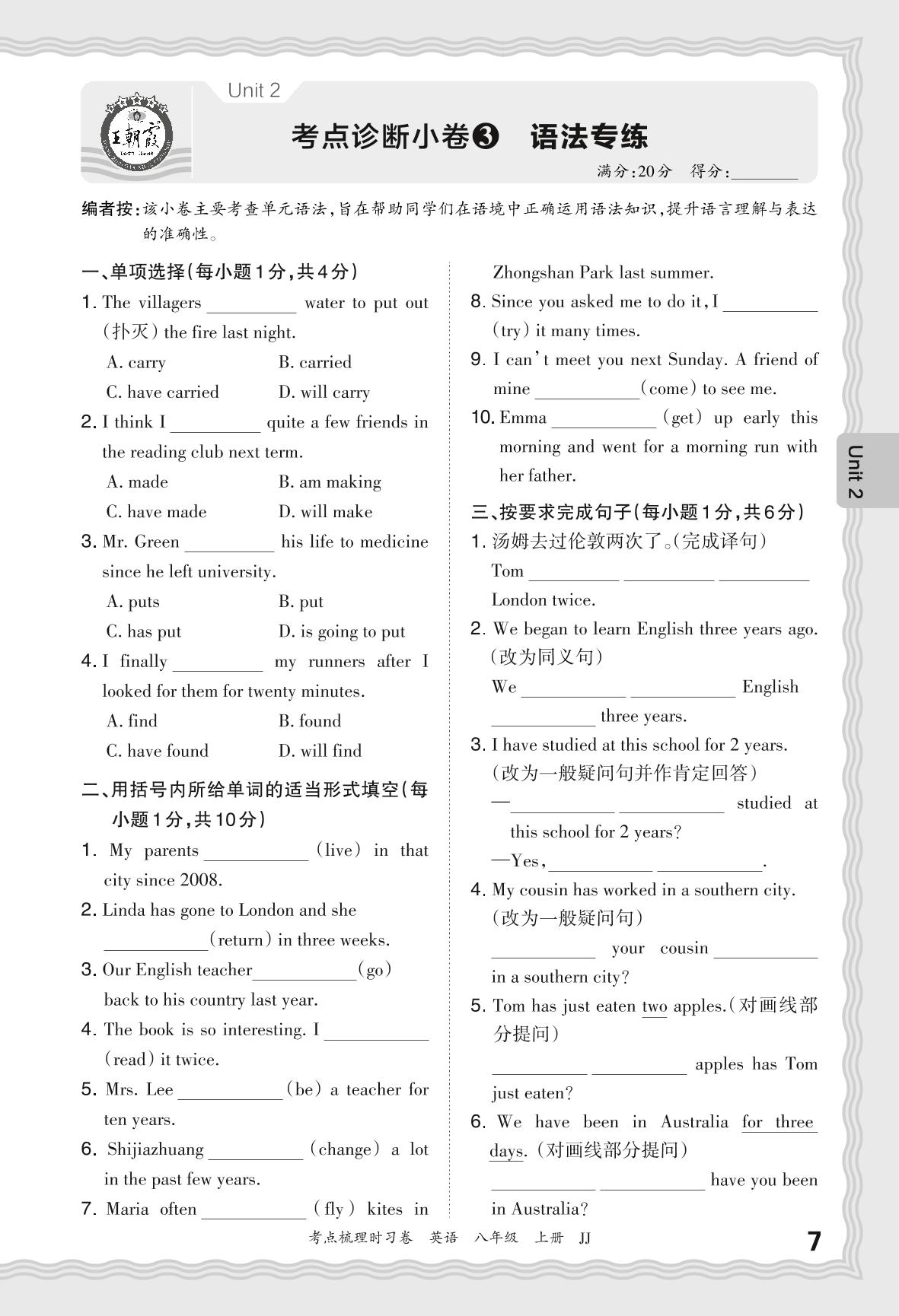 2024秋上册八年级英语冀教版 Unit 2 考点诊断小卷3 语法专练