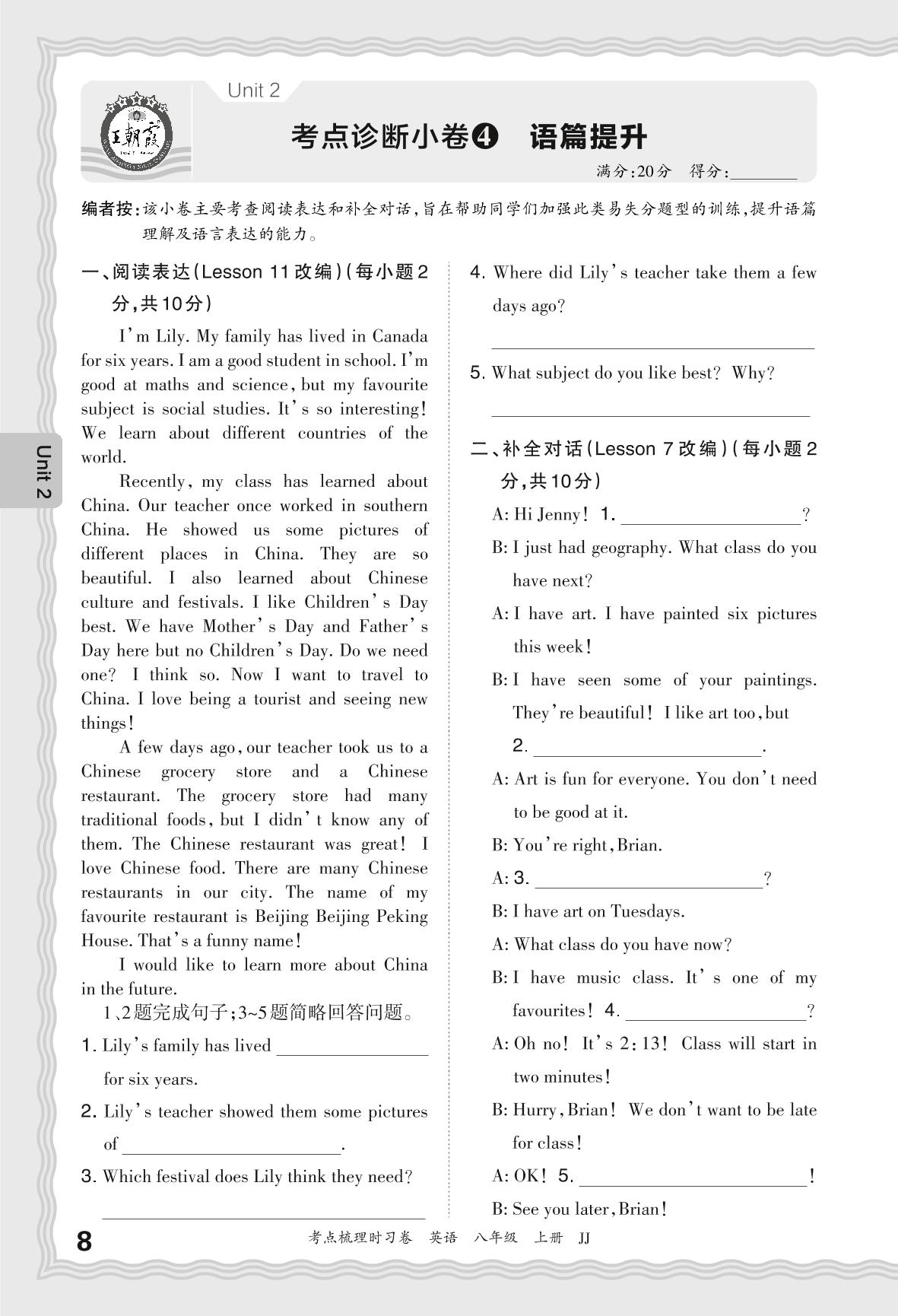 2024秋上册八年级英语冀教版 Unit 2 考点诊断小卷4 语篇提升