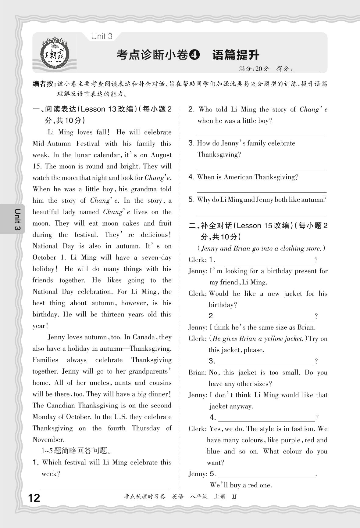 2024秋上册八年级英语冀教版 Unit 3 考点诊断小卷4 语篇提升