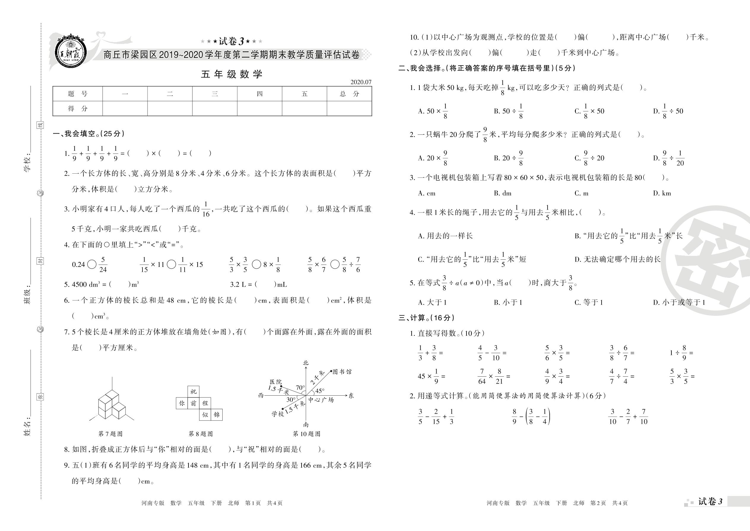 2019-2020学年第二学期商丘市梁园区五年级数学试卷(北师版)【3】