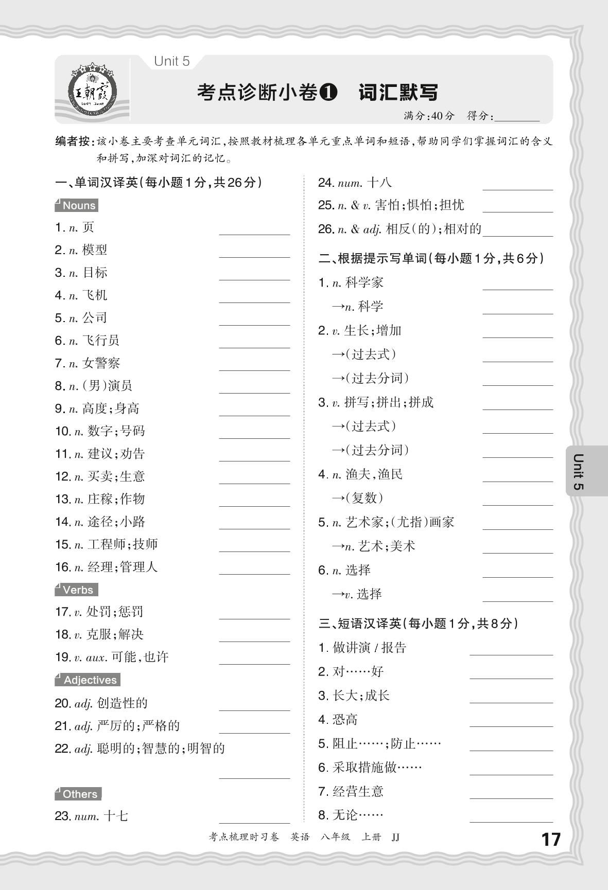 2024秋上册八年级英语冀教版 Unit 5 考点诊断小卷1 词汇默写