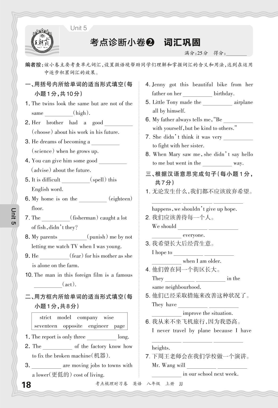 2024秋上册八年级英语冀教版 Unit 5 考点诊断小卷2 词汇巩固