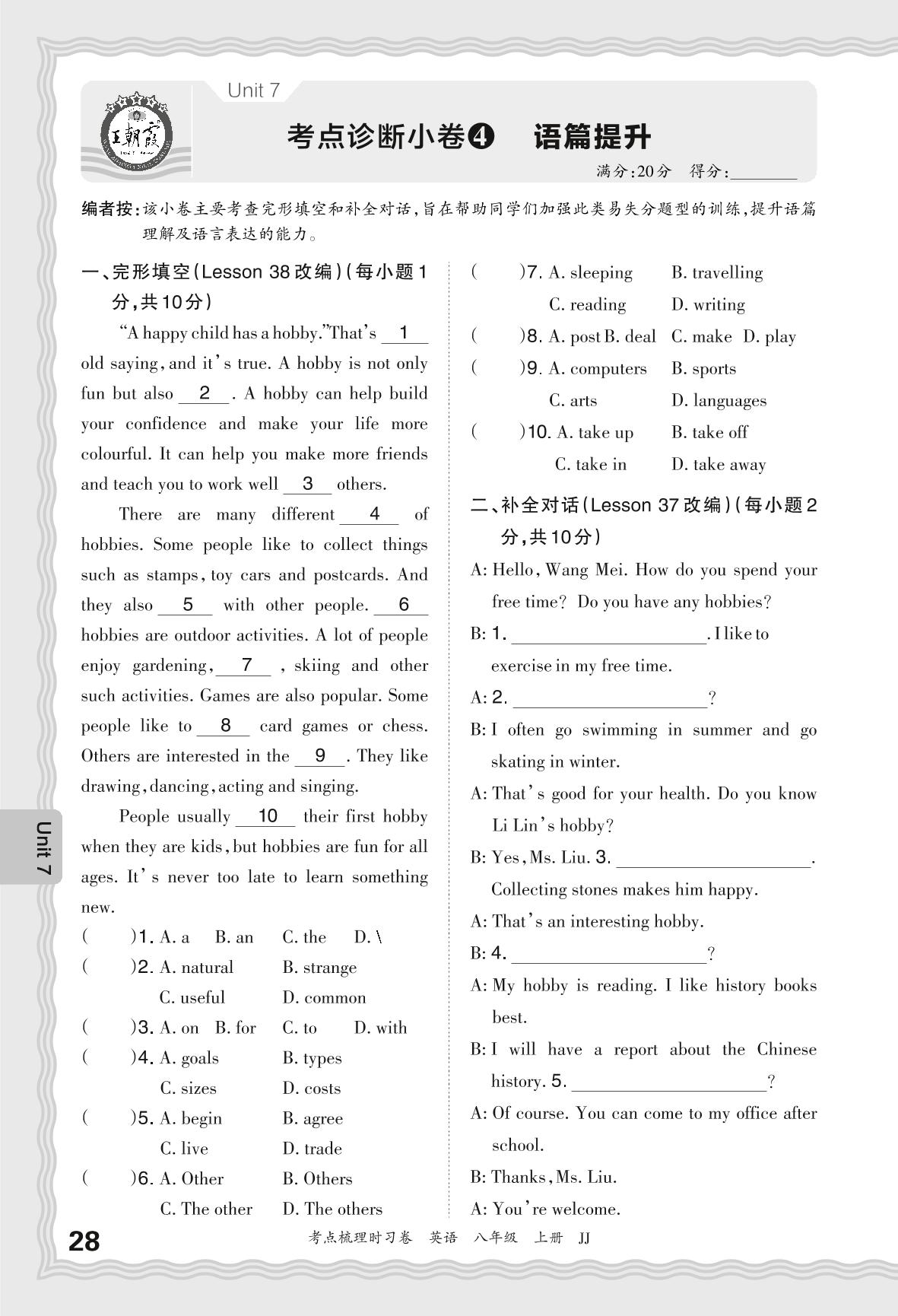 2024秋上册八年级英语冀教版 Unit 7 考点诊断小卷4 语篇提升