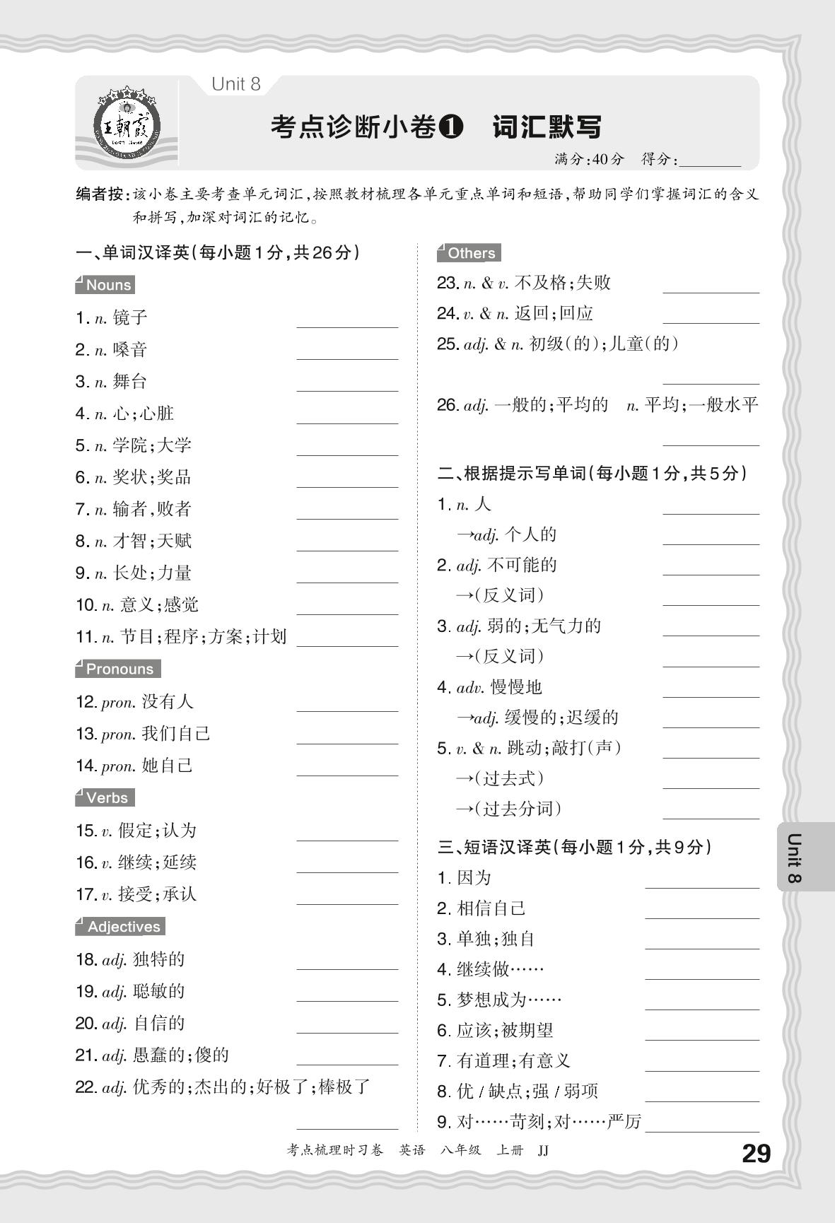 2024秋上册八年级英语冀教版 Unit 8 考点诊断小卷1 词汇默写