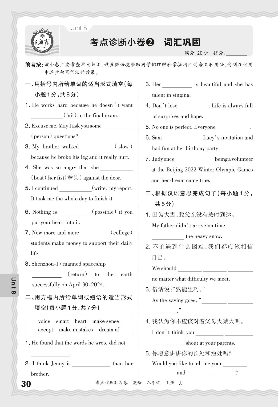2024秋上册八年级英语冀教版 Unit 8 考点诊断小卷2 词汇巩固