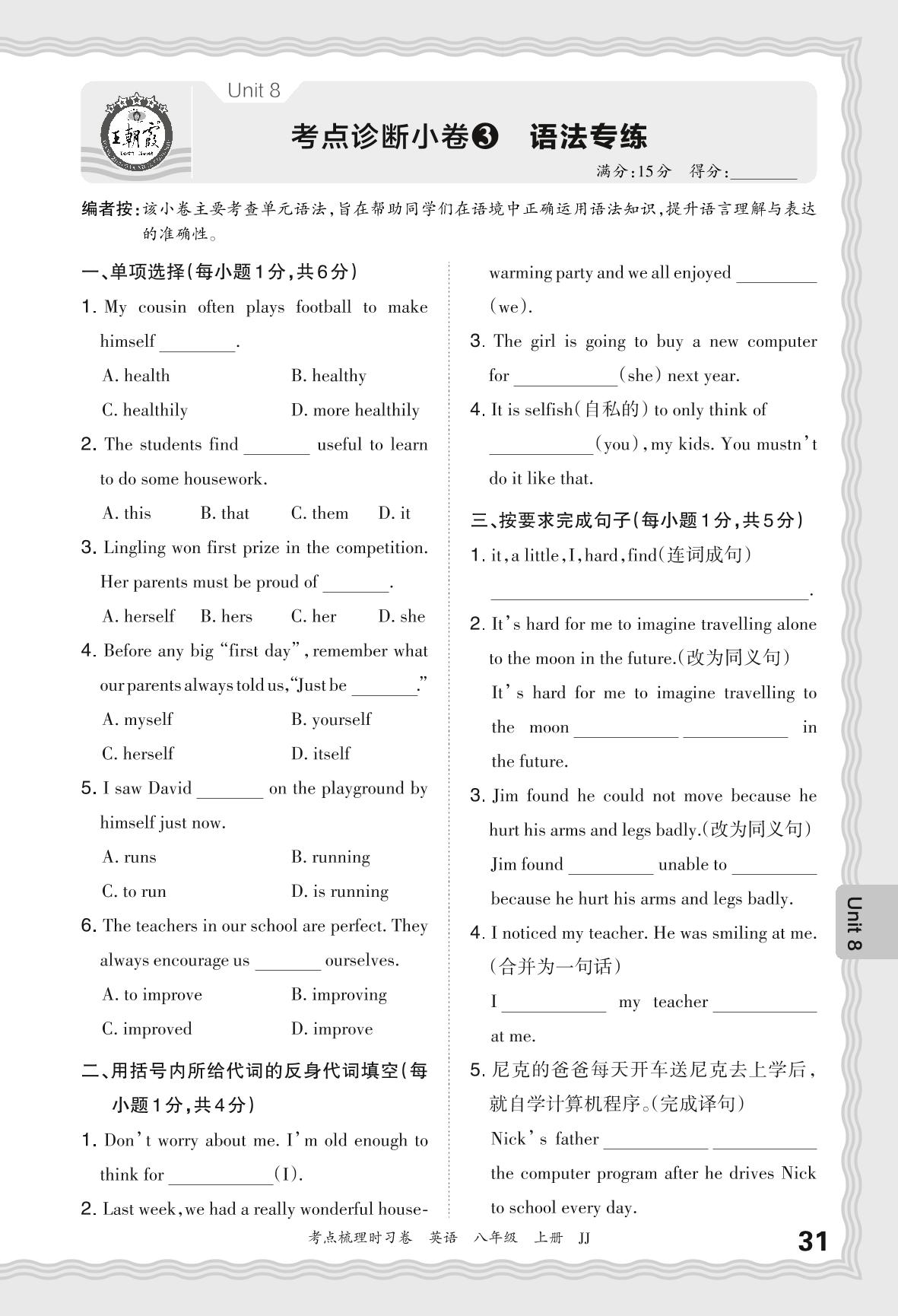 2024秋上册八年级英语冀教版 Unit 8 考点诊断小卷3 语法专练