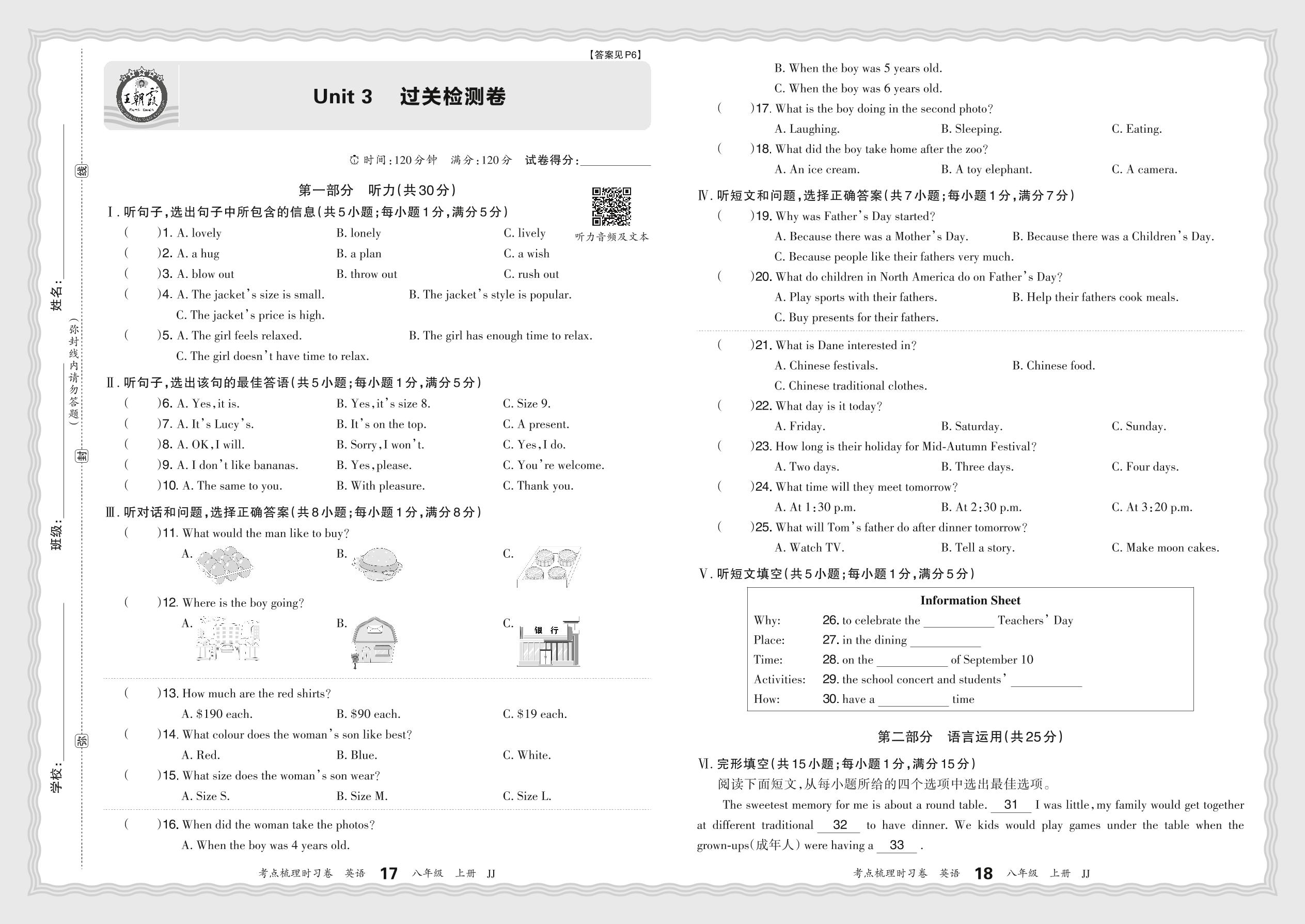 2024秋上册八年级英语冀教版 Unit 3 过关检测卷