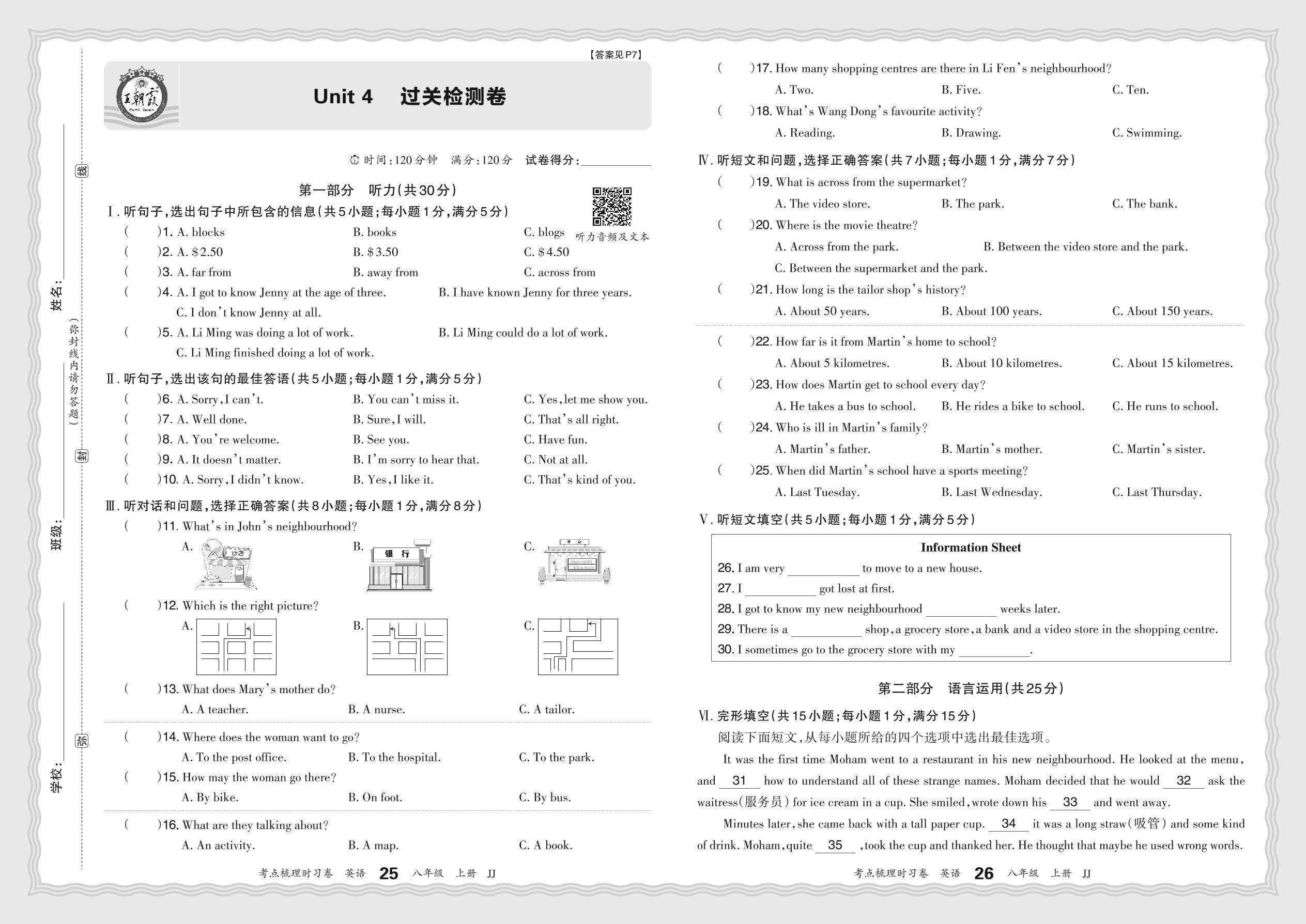 2024秋上册八年级英语冀教版 Unit 4 过关检测卷