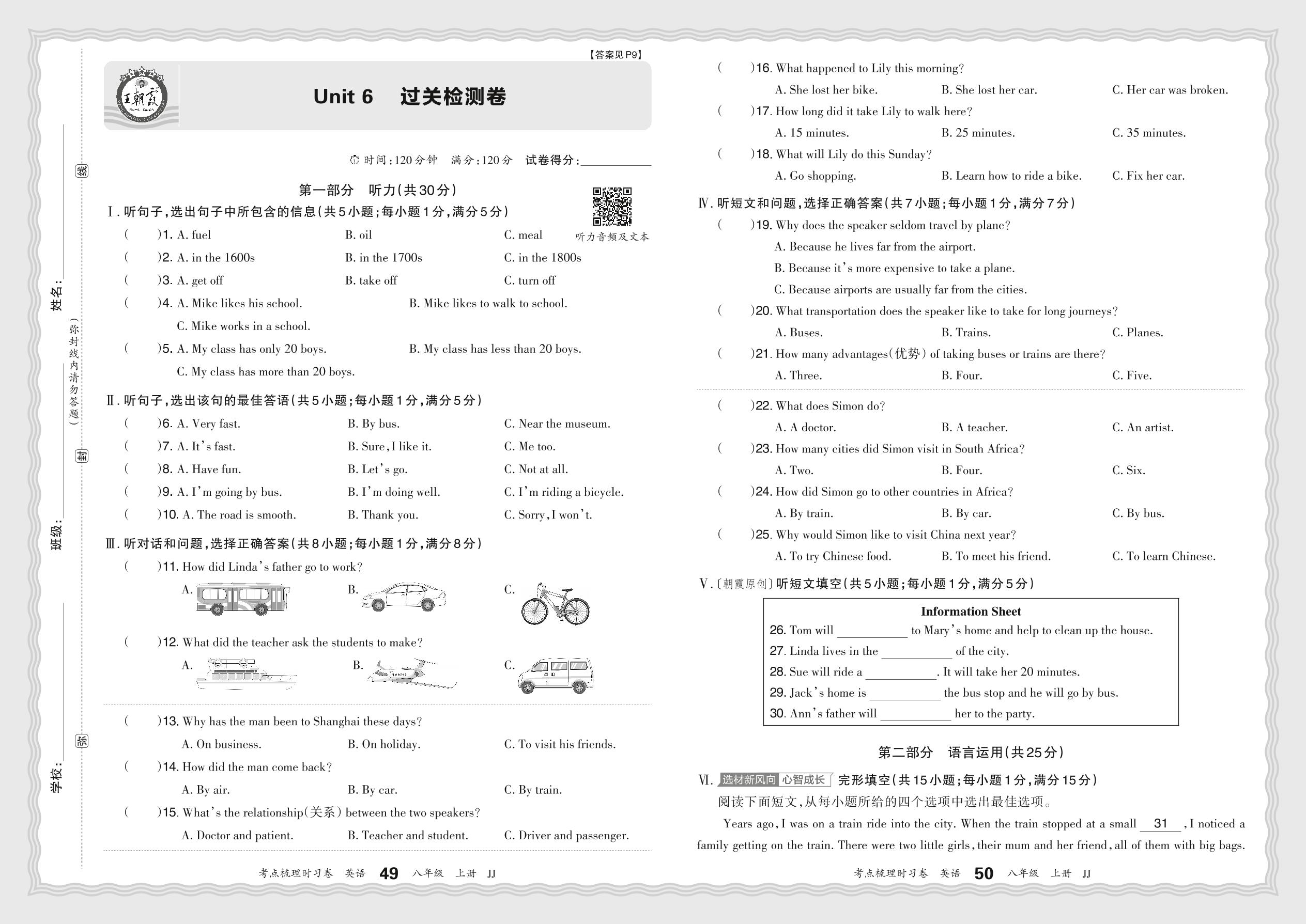 2024秋上册八年级英语冀教版 Unit 6 过关检测卷