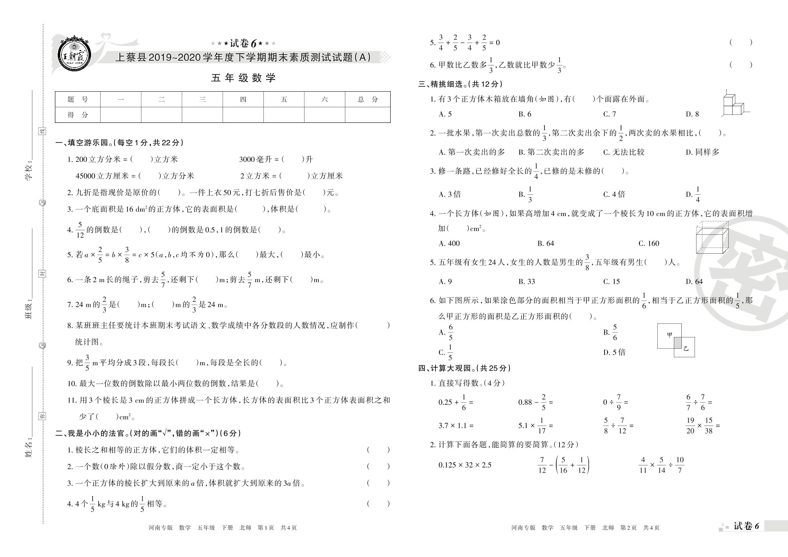 2019-2020学年第二学期驻马店市上蔡县五年级数学试卷(北师版)【6】