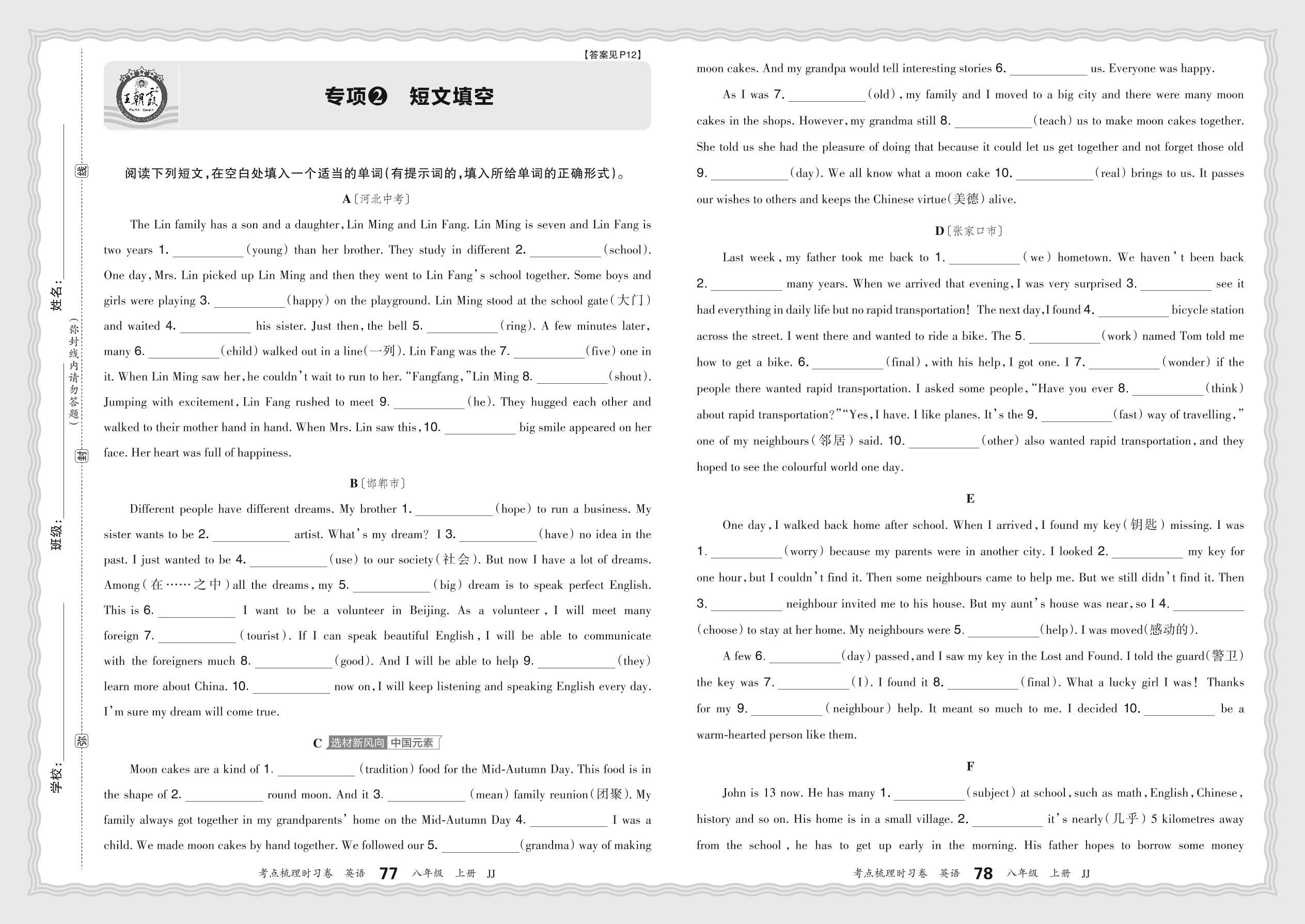 2024秋上册八年级英语冀教版 期末专项卷KD版·短文阅读【2】