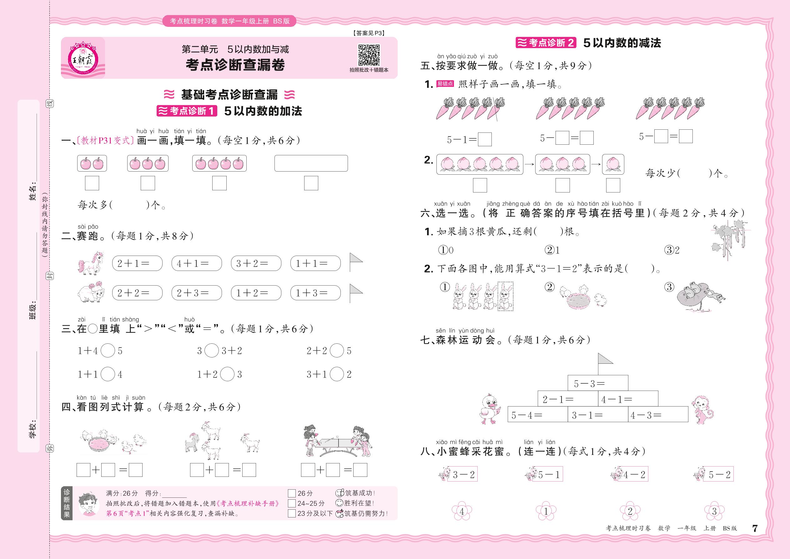 2024秋上册一年级数学北师版 第二单元 考点诊断查漏卷