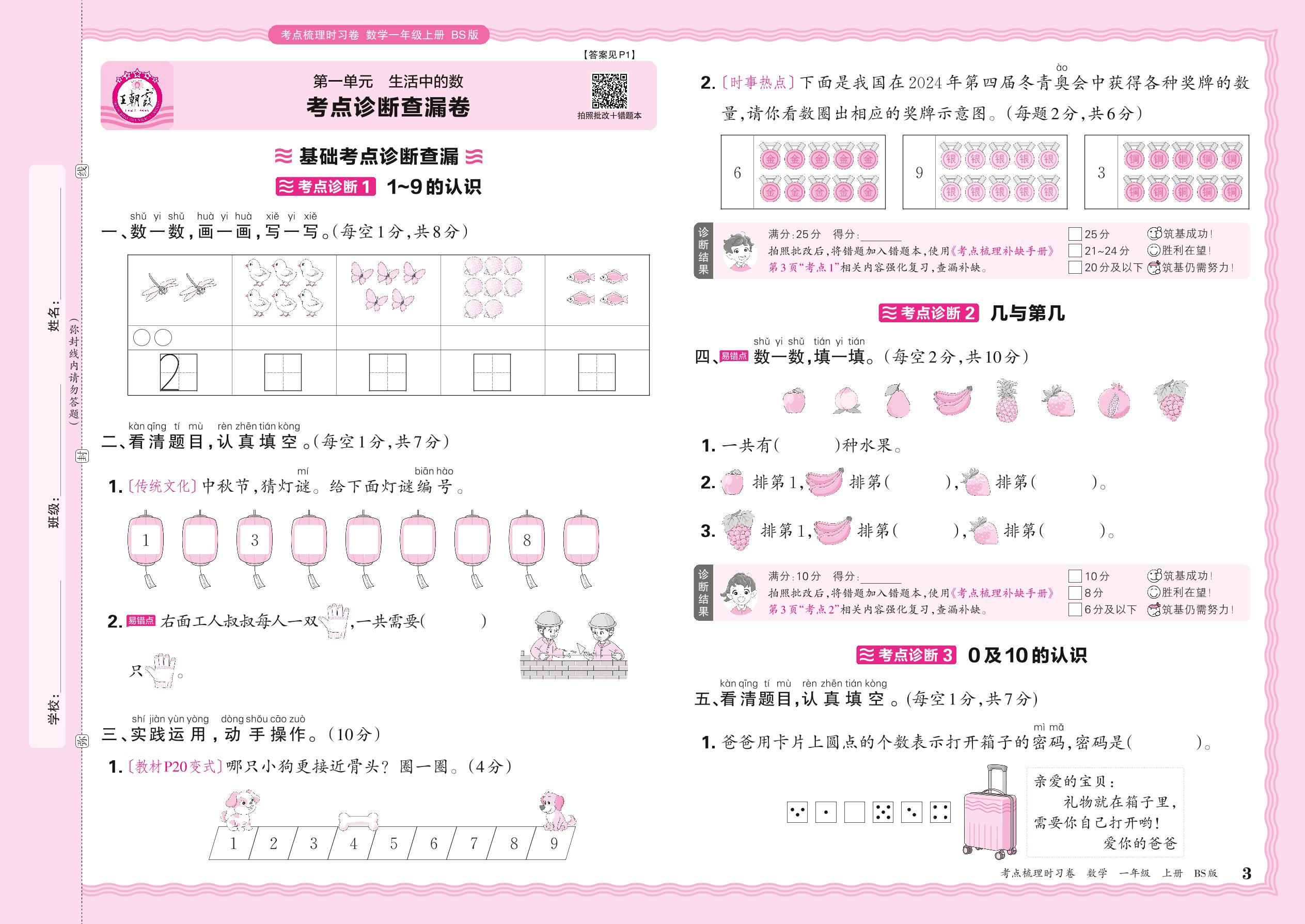 2024秋上册一年级数学北师版 第一单元 考点诊断查漏卷