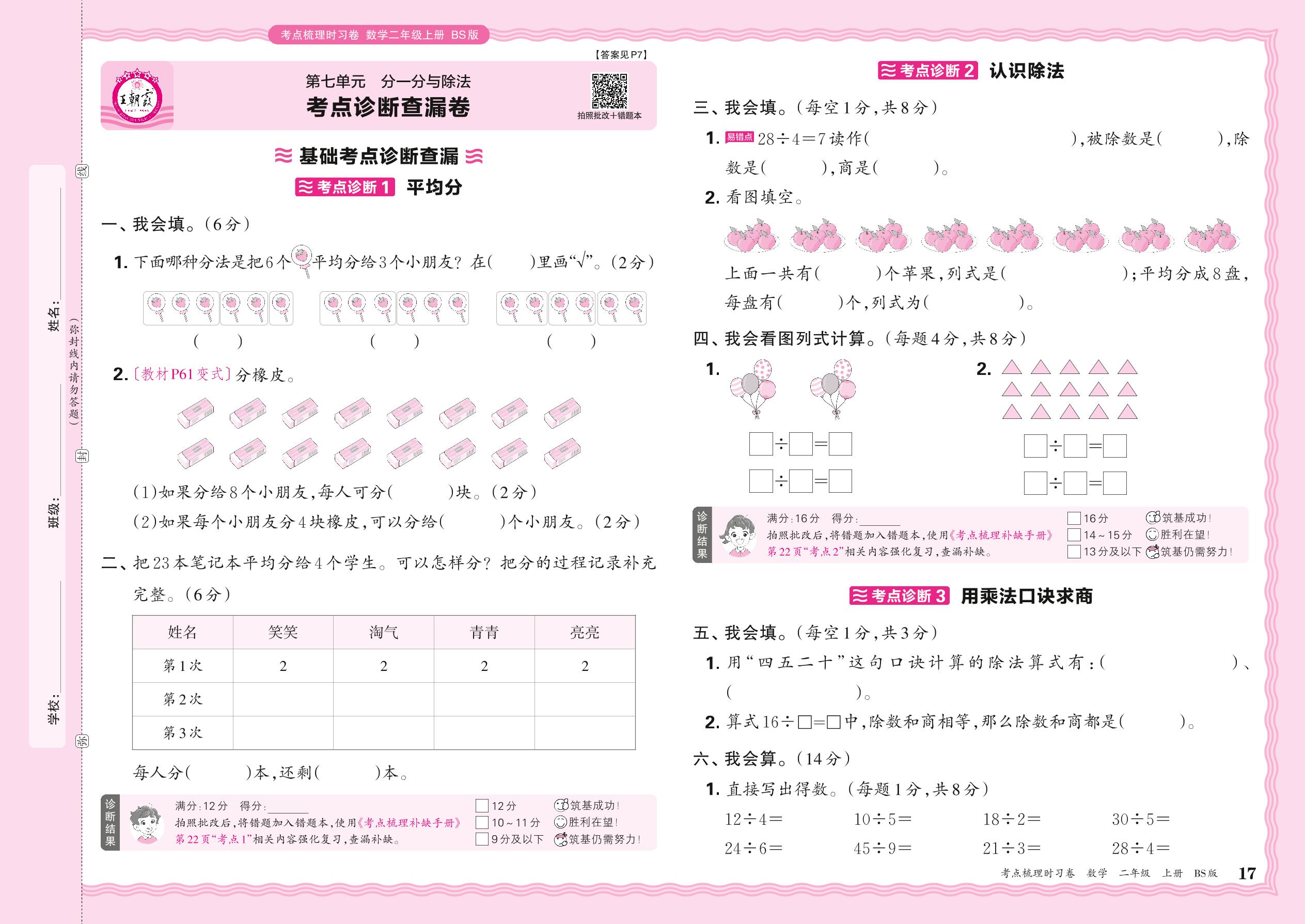 2024秋上册二年级数学北师版 第七单元 考点诊断查漏卷