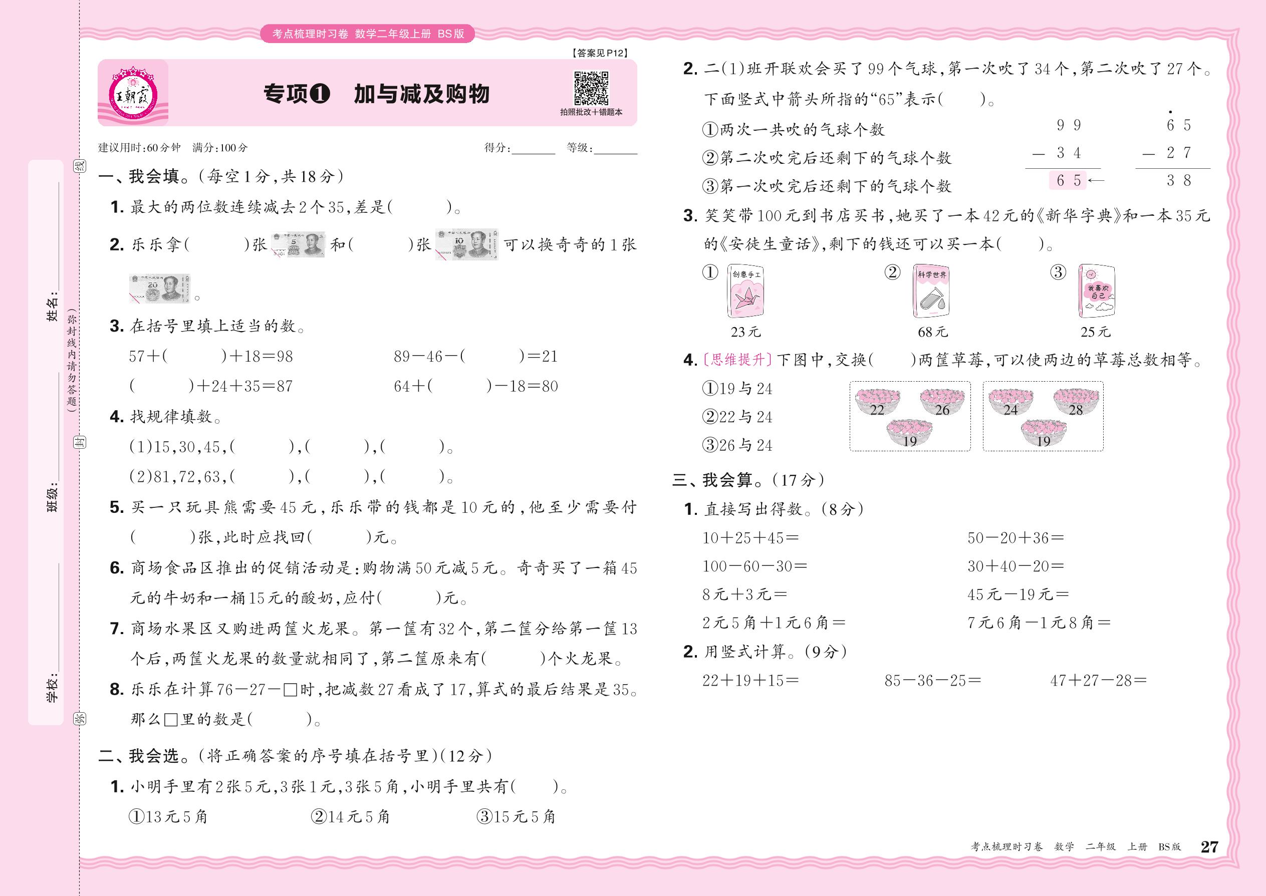 2024秋上册二年级数学北师版 期末专项卷KD版·加与减及购物【1】