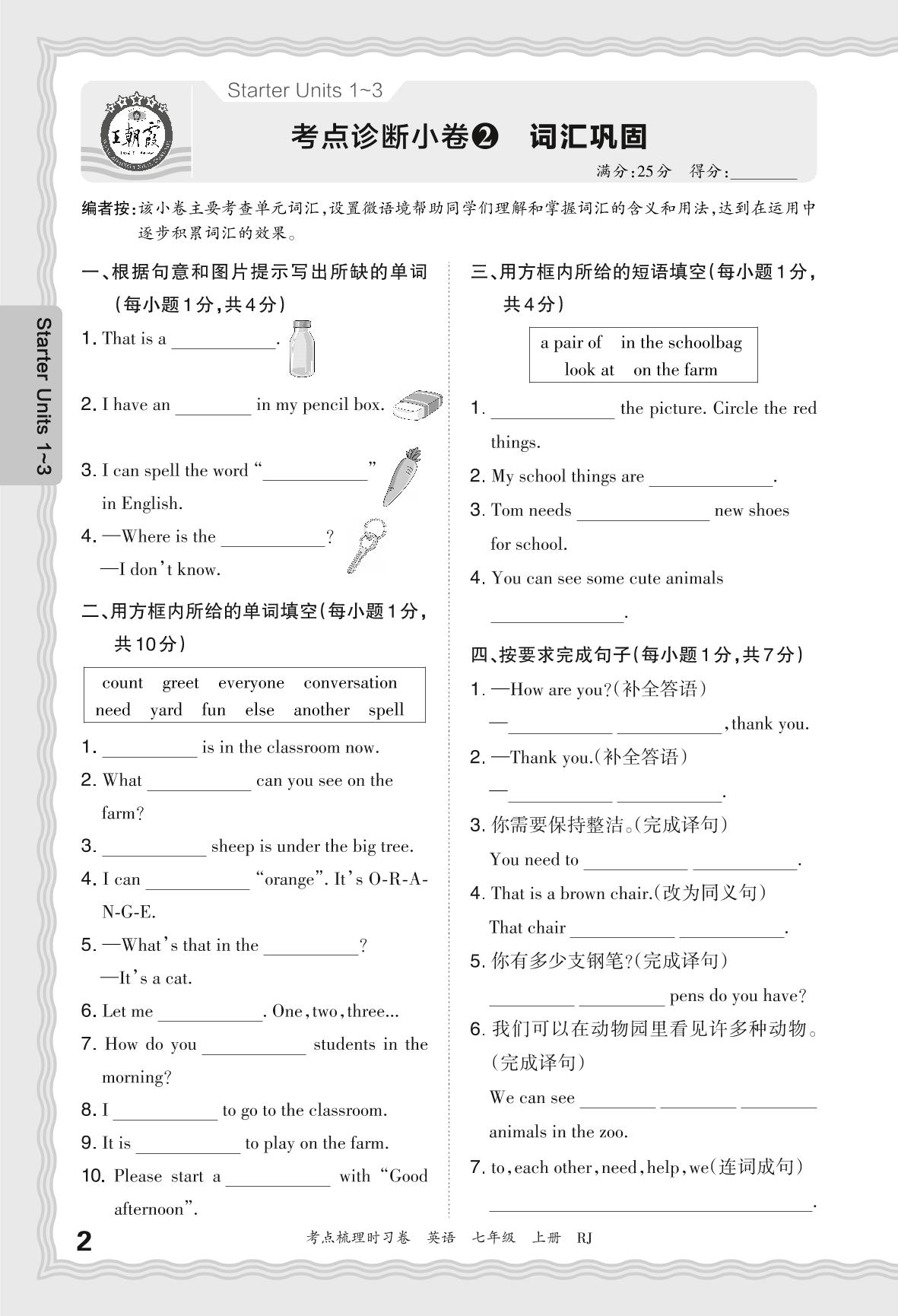2024秋上册七年级英语人教版 Starter Units 1-3 考点诊断小卷2 词汇巩固