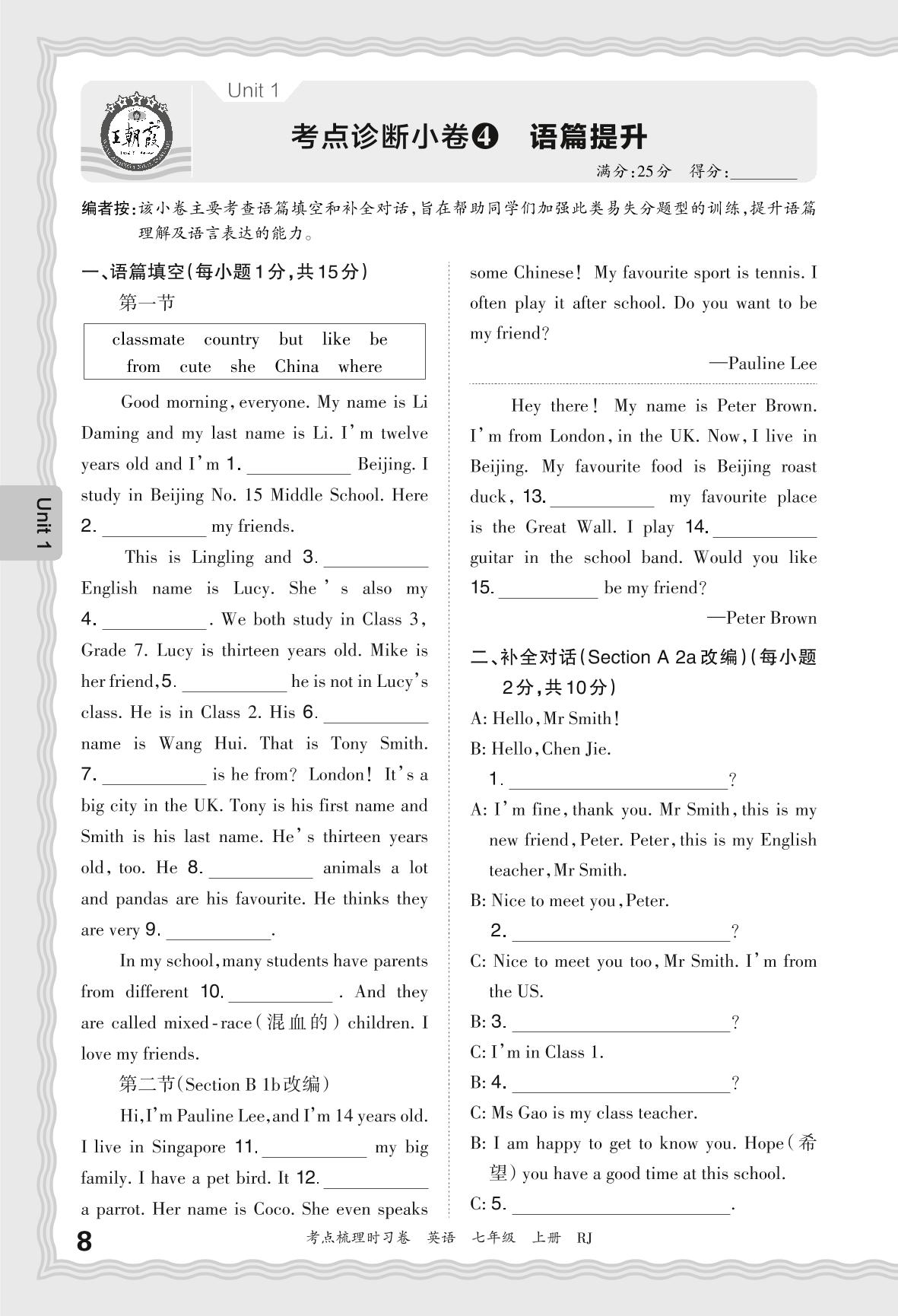 2024秋上册七年级英语人教版 Unit 1 考点诊断小卷4 语篇提升