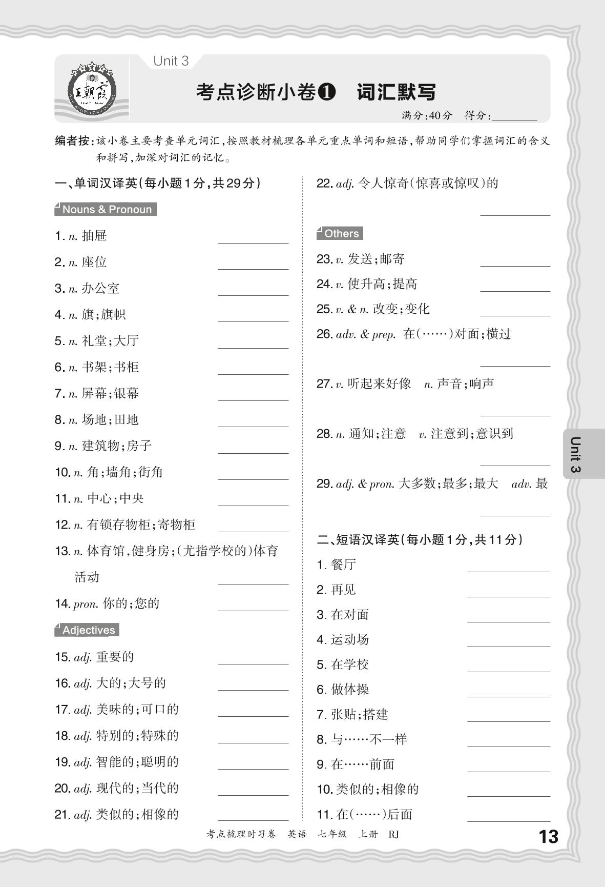 2024秋上册七年级英语人教版 Unit 3 考点诊断小卷1 词汇默写