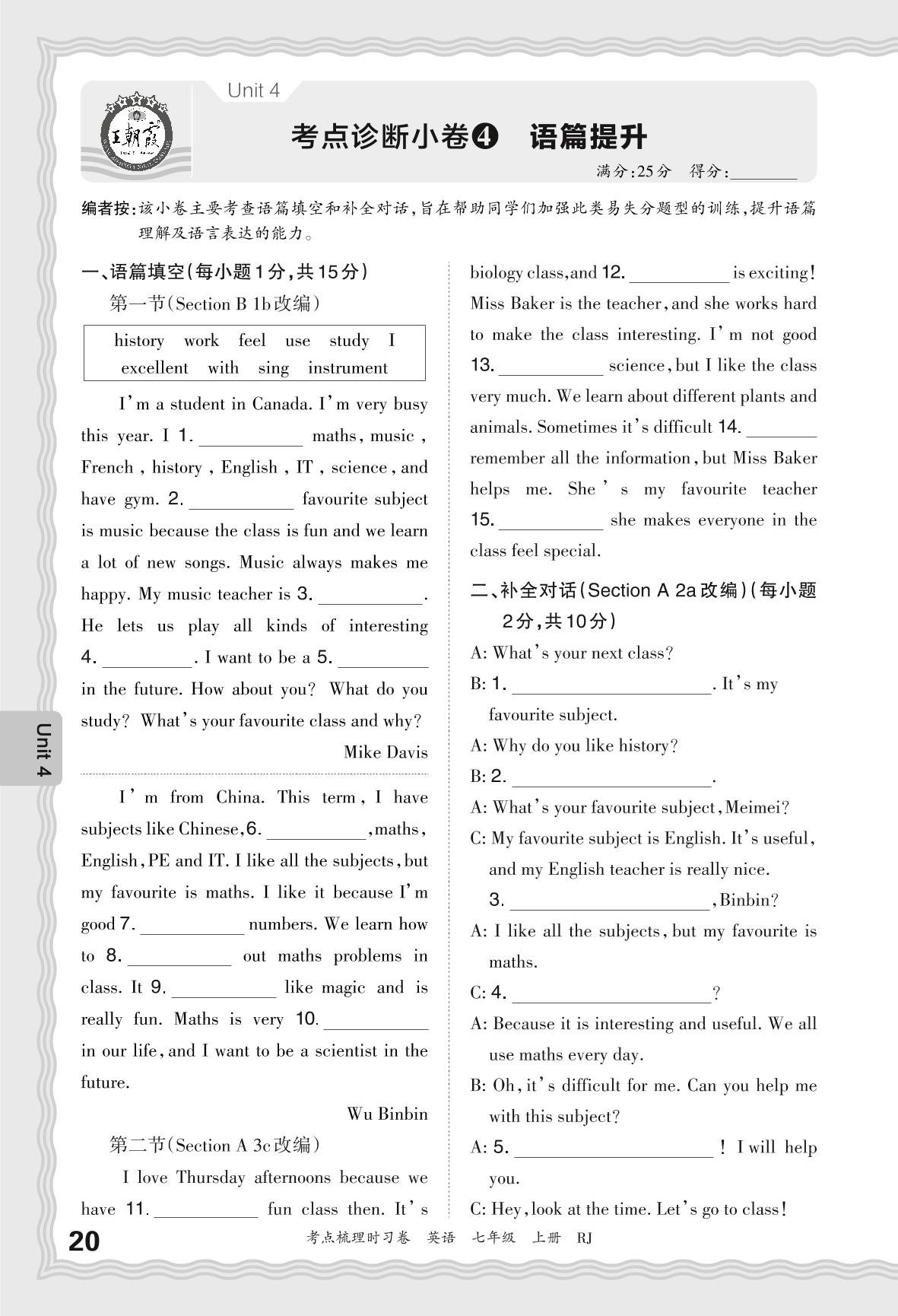 2024秋上册七年级英语人教版 Unit 4 考点诊断小卷4 语篇提升