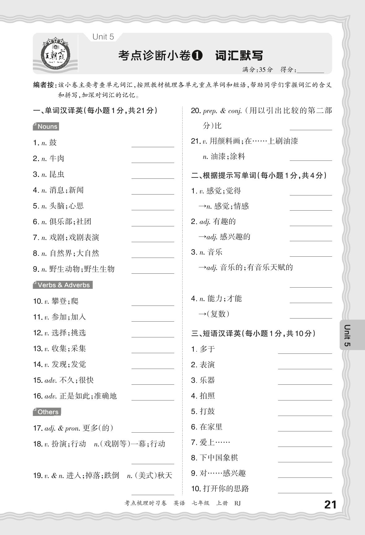 2024秋上册七年级英语人教版 Unit 5 考点诊断小卷1 词汇默写