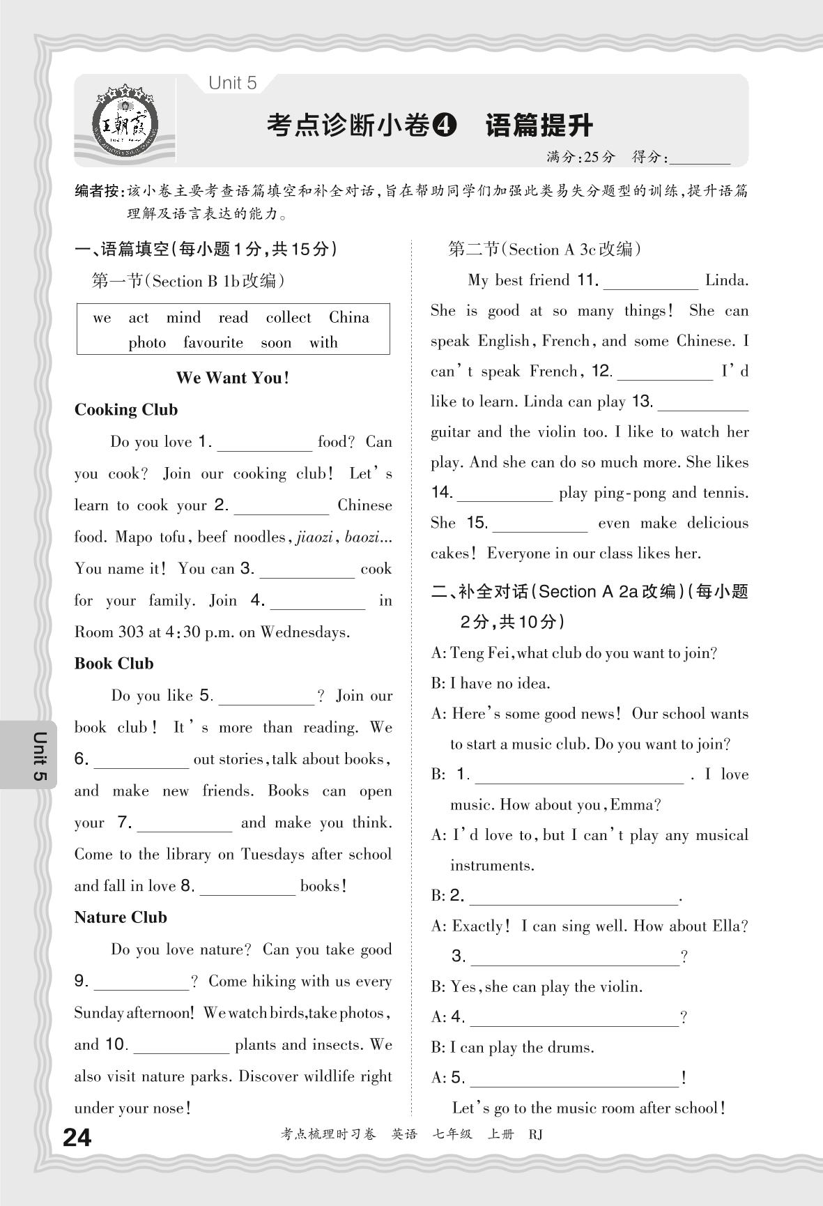 2024秋上册七年级英语人教版 Unit 5 考点诊断小卷4 语篇提升