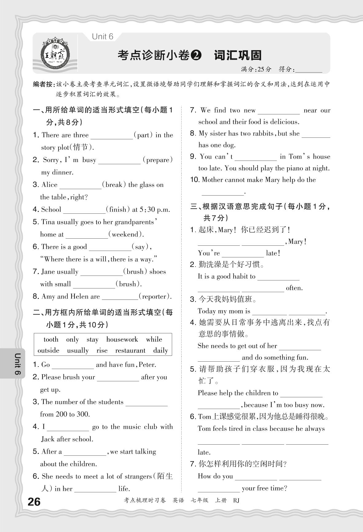 2024秋上册七年级英语人教版 Unit 6 考点诊断小卷2 词汇巩固