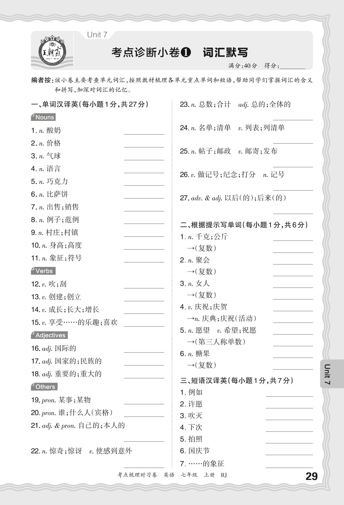 2024秋上册七年级英语人教版 Unit 7 考点诊断小卷1 词汇默写