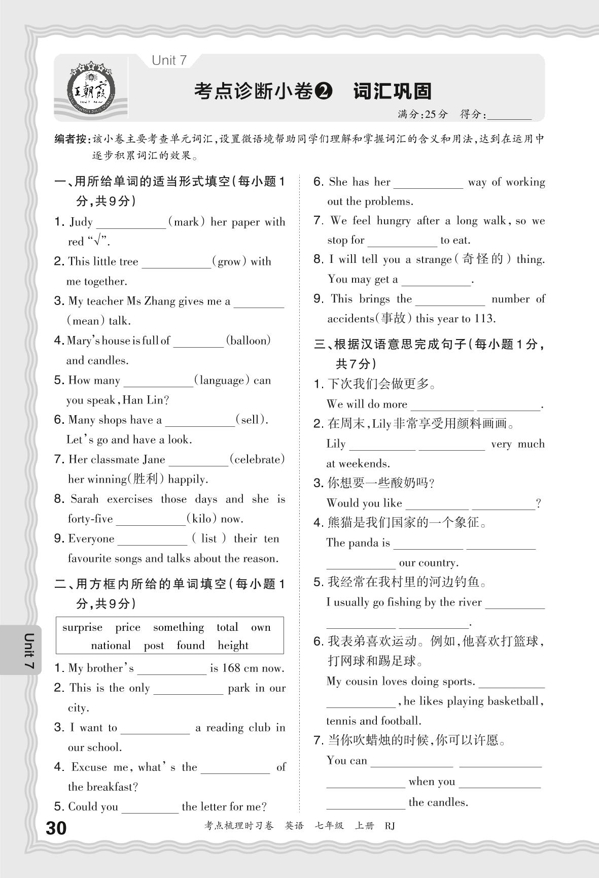 2024秋上册七年级英语人教版 Unit 7 考点诊断小卷2 词汇巩固