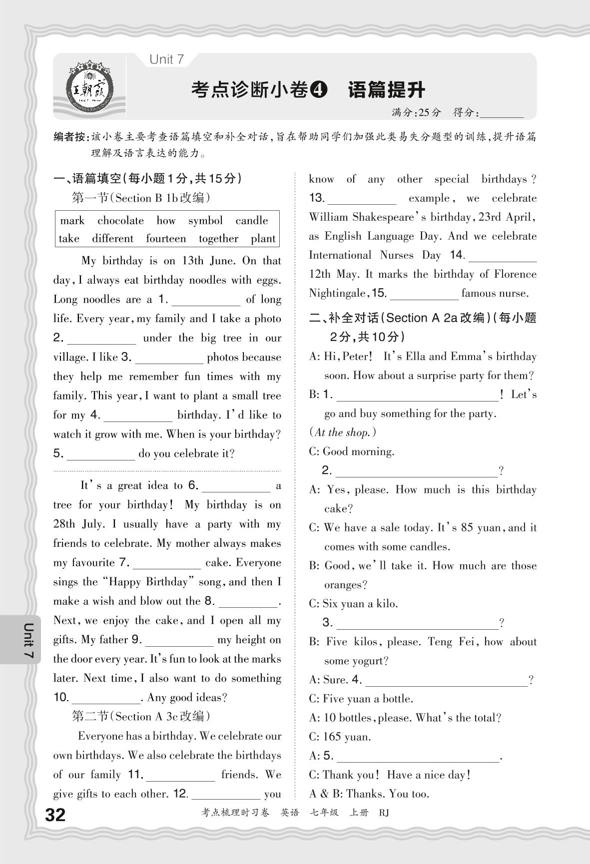 2024秋上册七年级英语人教版 Unit 7 考点诊断小卷4 语篇提升