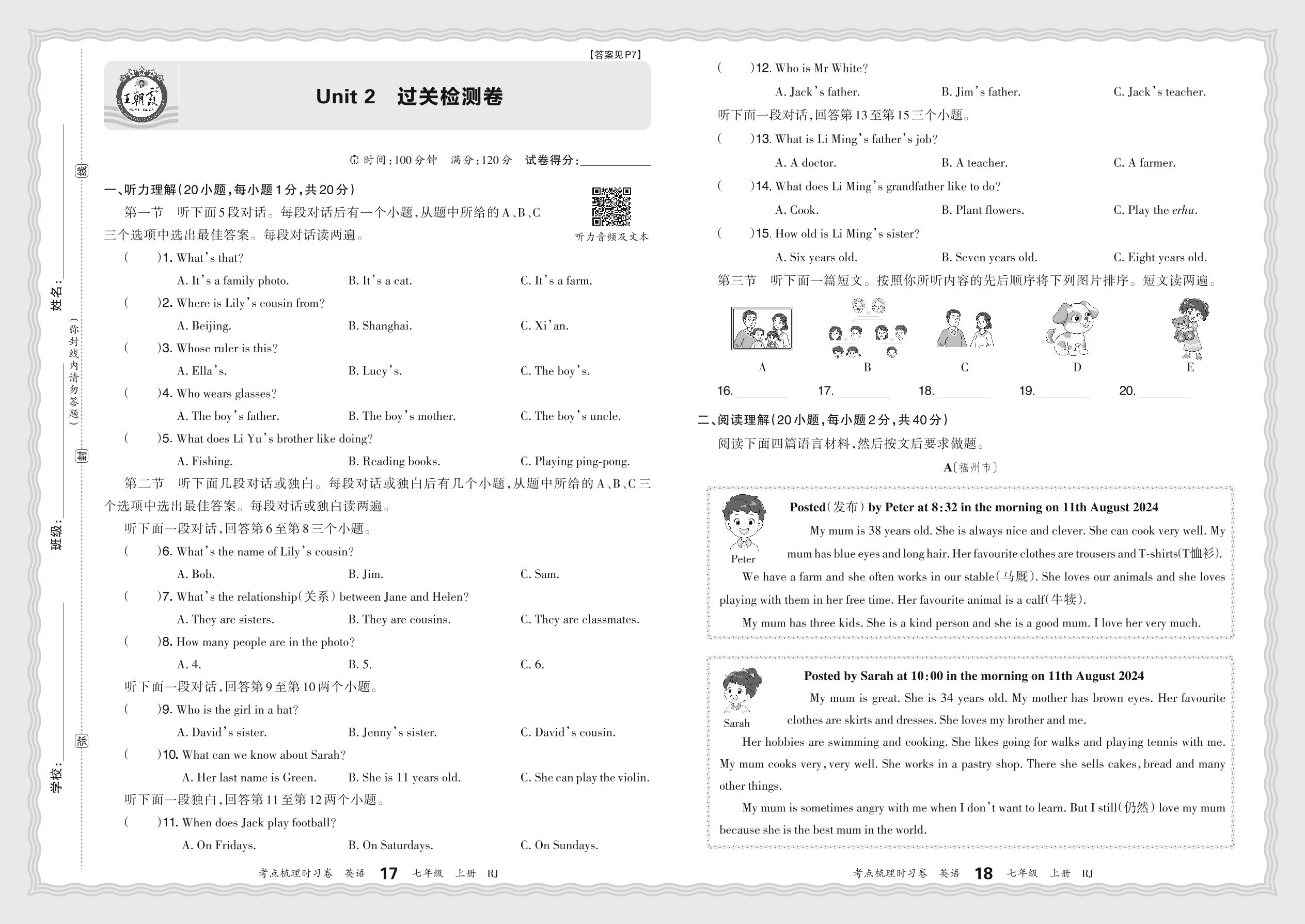 2024秋上册七年级英语人教版 Unit 2 过关检测卷