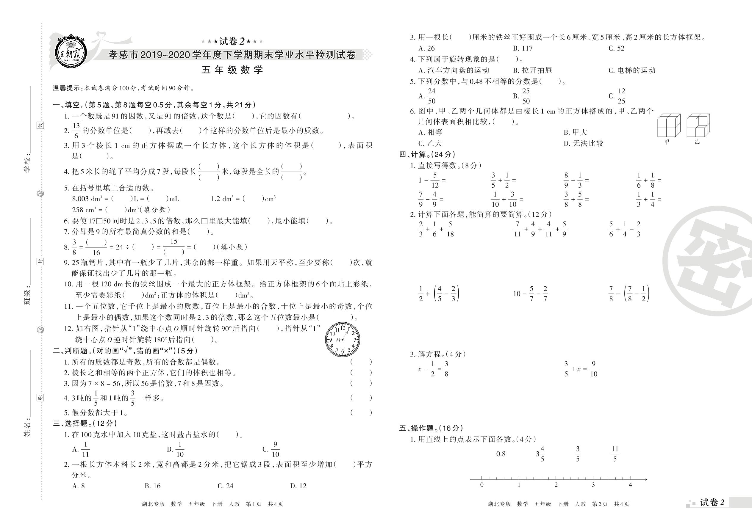 2019-2020学年第二学期孝感市五年级数学试卷(人教版)【2】
