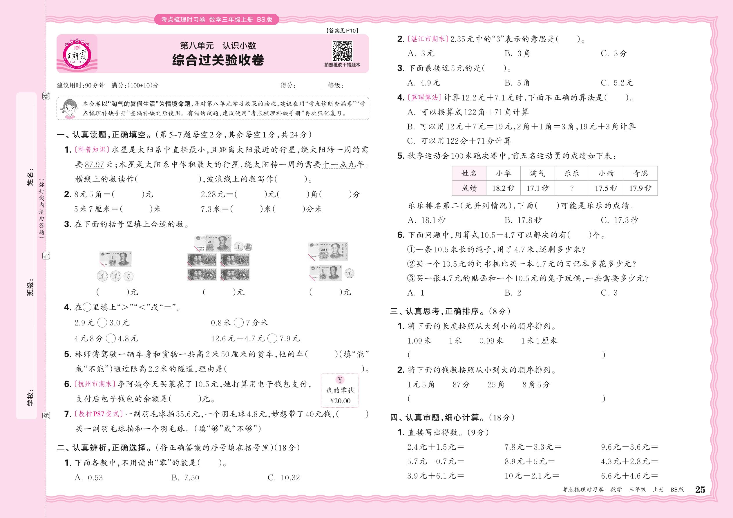 2024秋上册三年级数学北师版 第八单元 综合过关验收卷