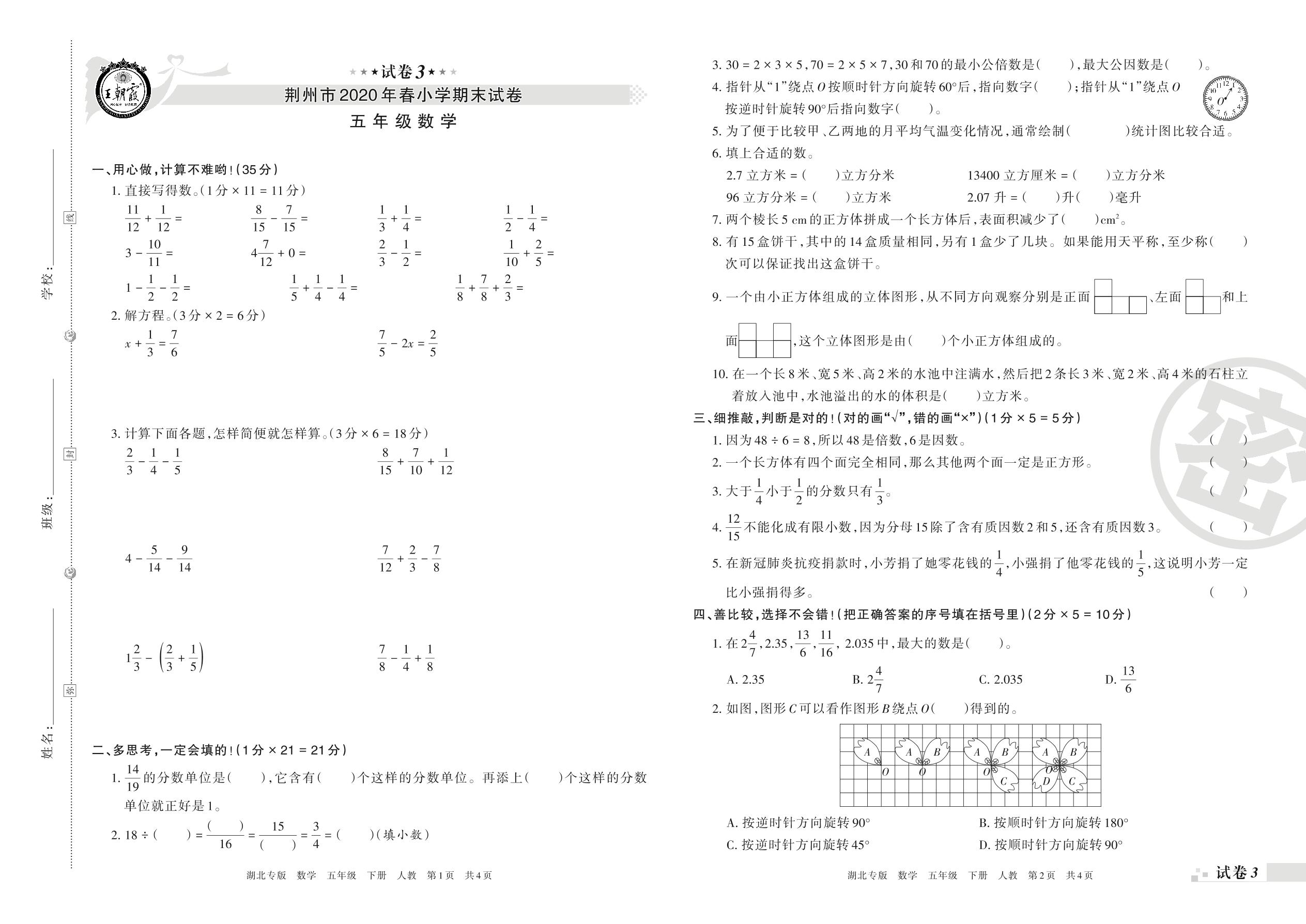 2019-2020学年第二学期荆州市五年级数学试卷(人教版)【3】