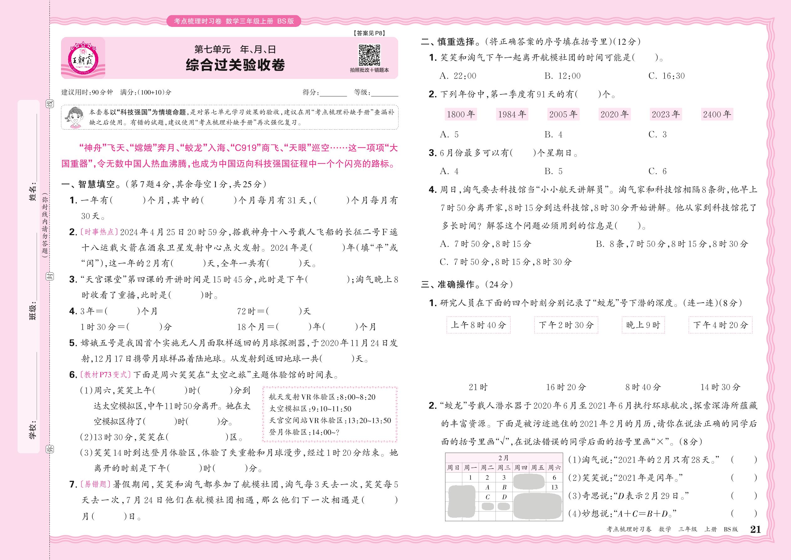 2024秋上册三年级数学北师版 第七单元 综合过关验收卷
