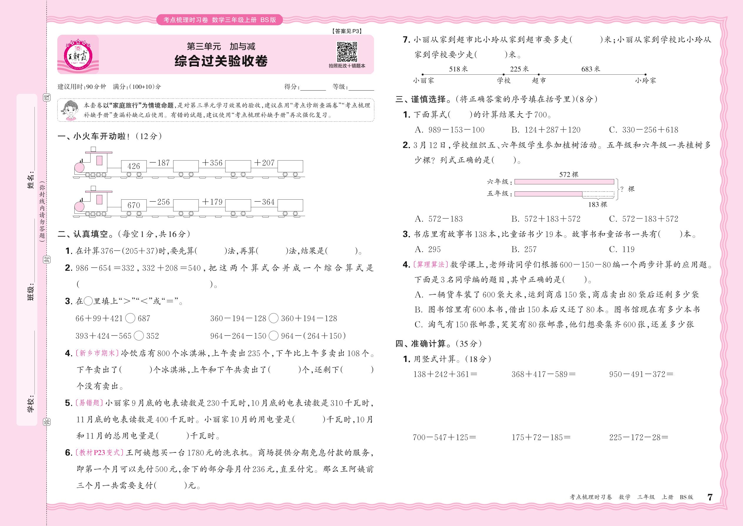 2024秋上册三年级数学北师版 第三单元 综合过关验收卷