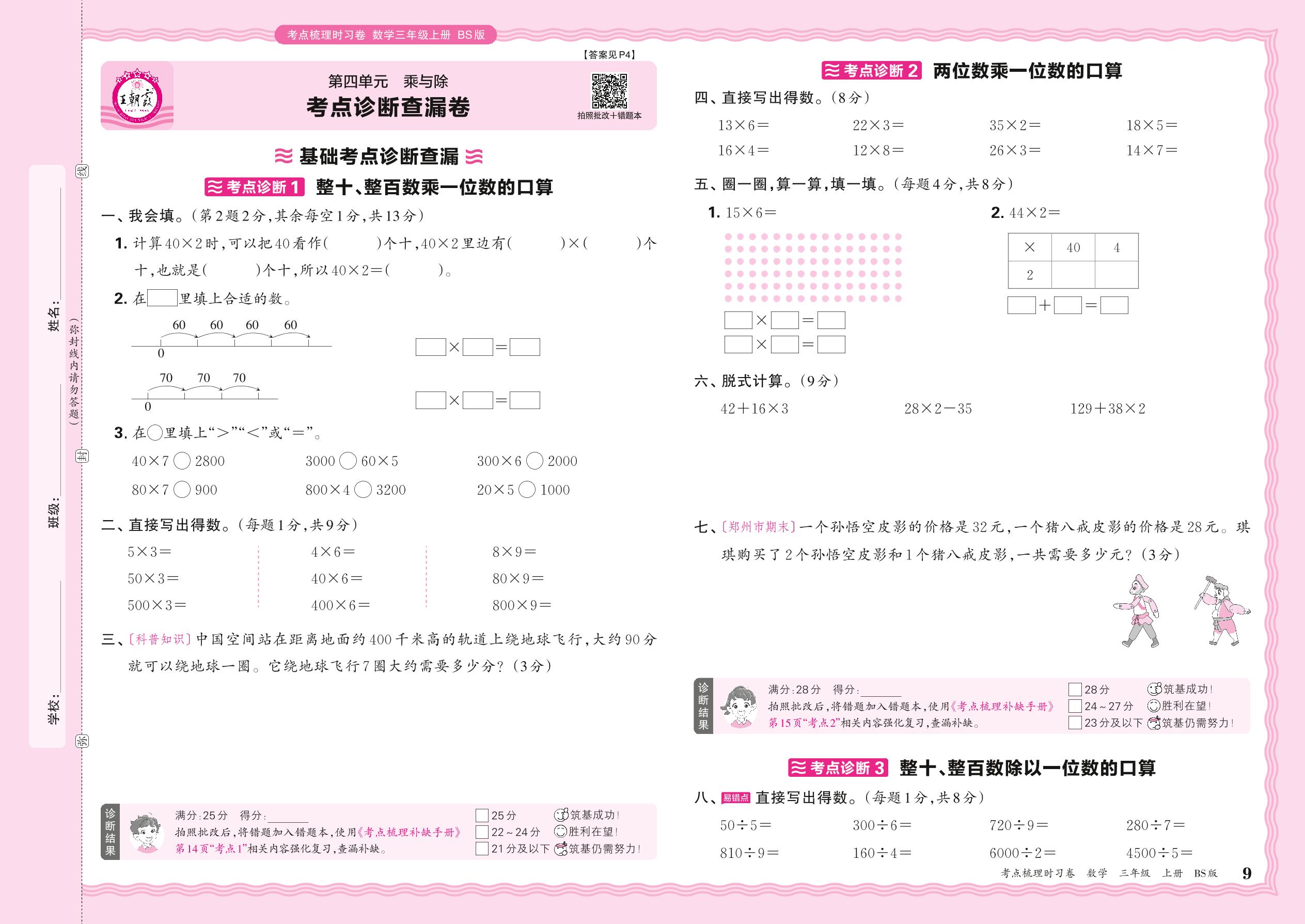 2024秋上册三年级数学北师版 第四单元 考点诊断查漏卷