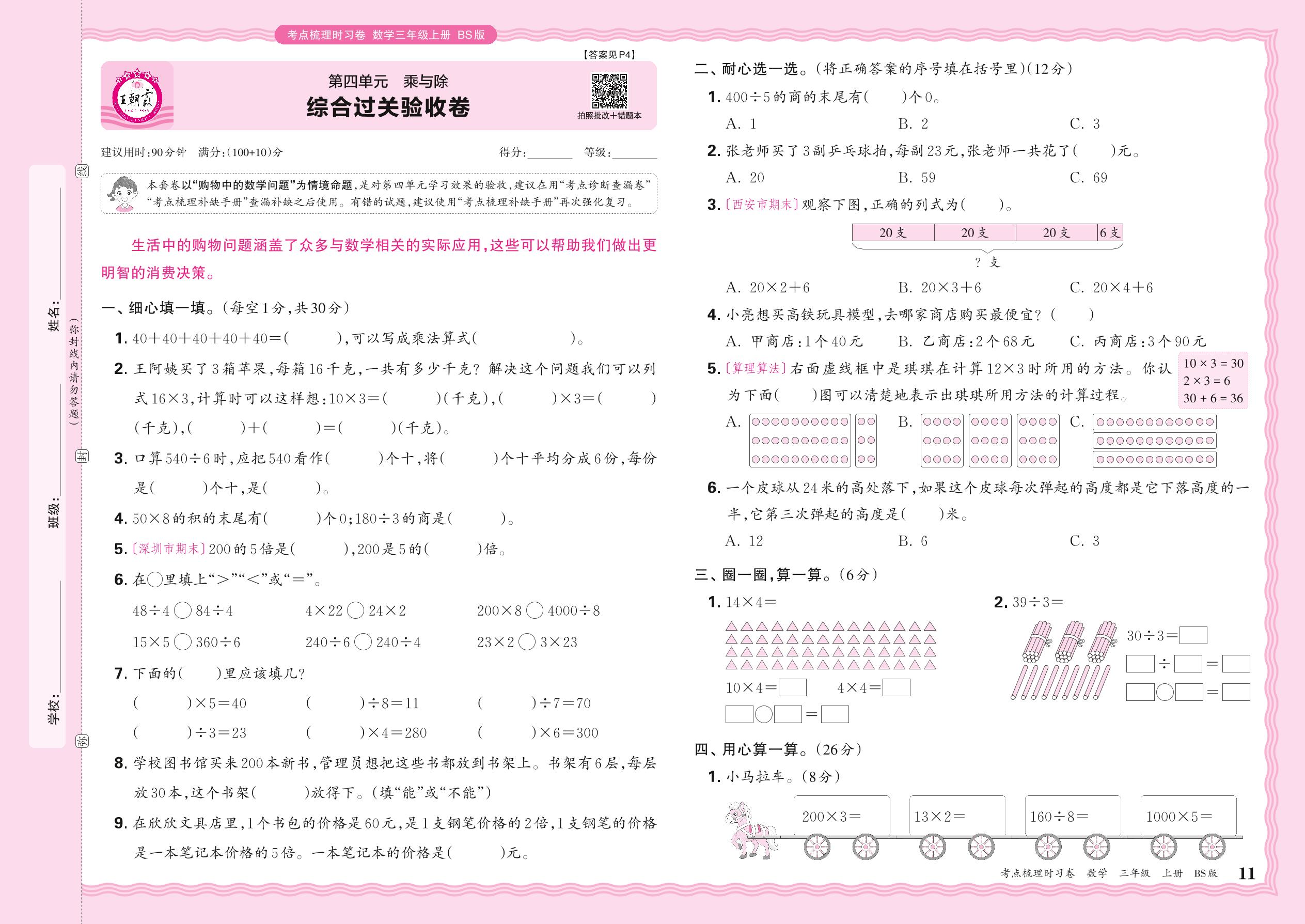 2024秋上册三年级数学北师版 第四单元 综合过关验收卷