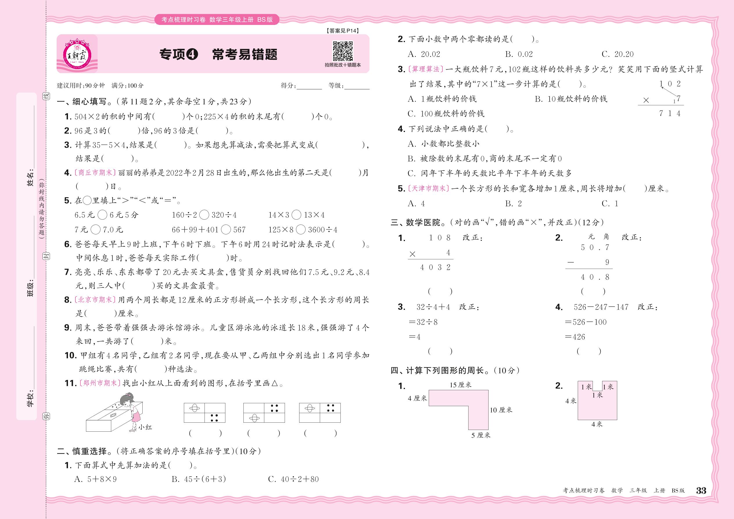 2024秋上册三年级数学北师版 期末专项卷KD版·常考易错题【4】